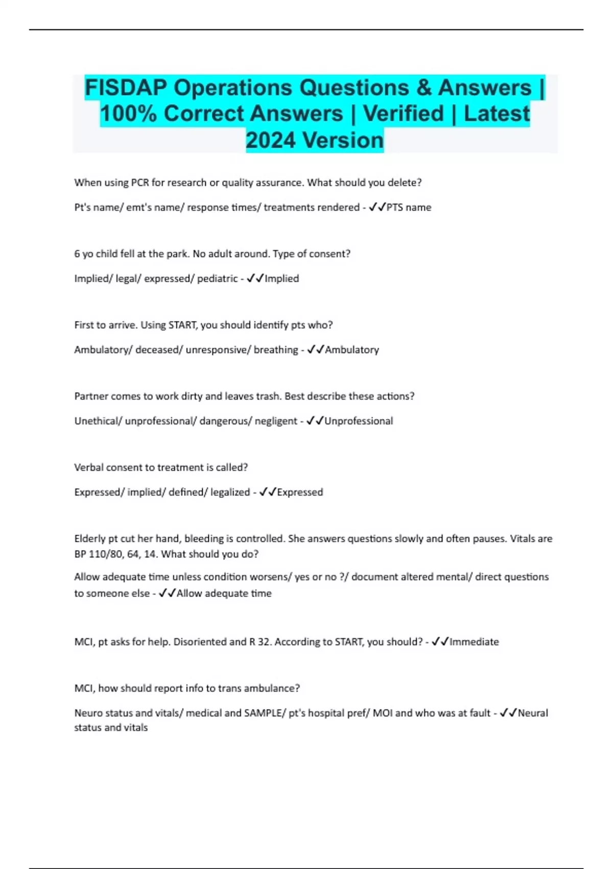 FISDAP Operations Questions & Answers | 100% Correct Answers | Verified | Latest 2024 Version