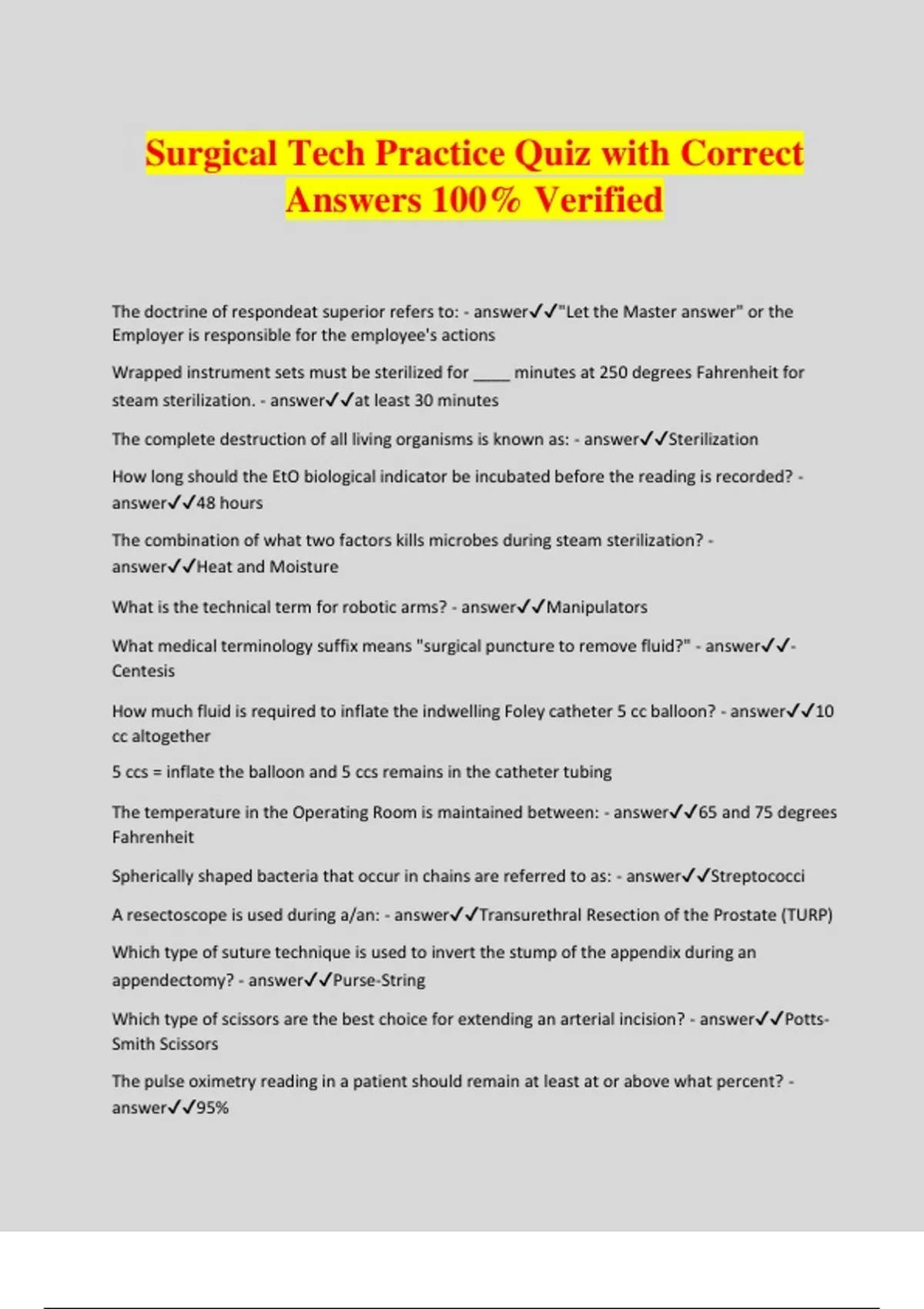 Surgical Tech Practice Quiz with Correct Answers 100% Verified The doctrine of respondeat superior refers to: - answer"Let the Master answer" or the Employer is responsible for the employee's actions Wrapped instrument sets must be sterilized for ____ minutes at 250 degrees Fahrenheit for steam sterilization. - answerat least 30 minutes The complete destruction of all living organisms is known as: - answerSterilization How long should the EtO biological indicator be incubated before the reading is recorded? - answer48 hours The combination of what two factors kills microbes during steam sterilization? - answerHeat and Moisture What is the technical term for robotic arms? - answerManipulators What medical terminology suffix means "surgical puncture to remove fluid?" - answer- Centesis How much fluid is required to inflate the indwelling Foley catheter 5 cc balloon? - answer10 cc altogether 5 ccs = inflate the balloon and 5 ccs remains in the catheter tubing The temperature in the Operating Room is maintained between: - answer65 and 75 degrees