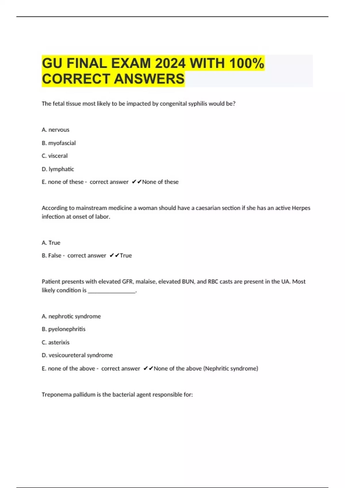 The fetal tissue most likely to be impacted by congenital syphilis would be? A. nervous B. myofascial C. visceral D. lymphatic E. none of these - correct answer None of these According to mainstream medicine a woman should have a caesarian section if she has an active Herpes infection at onset of labor. A. True B. False - correct answer True Patient presents with elevated GFR, malaise, elevated BUN, and RBC casts are present in the UA. Most likely condition is _______________. A. nephrotic syndrome B. pyelonephritis C. asterixis D. ve