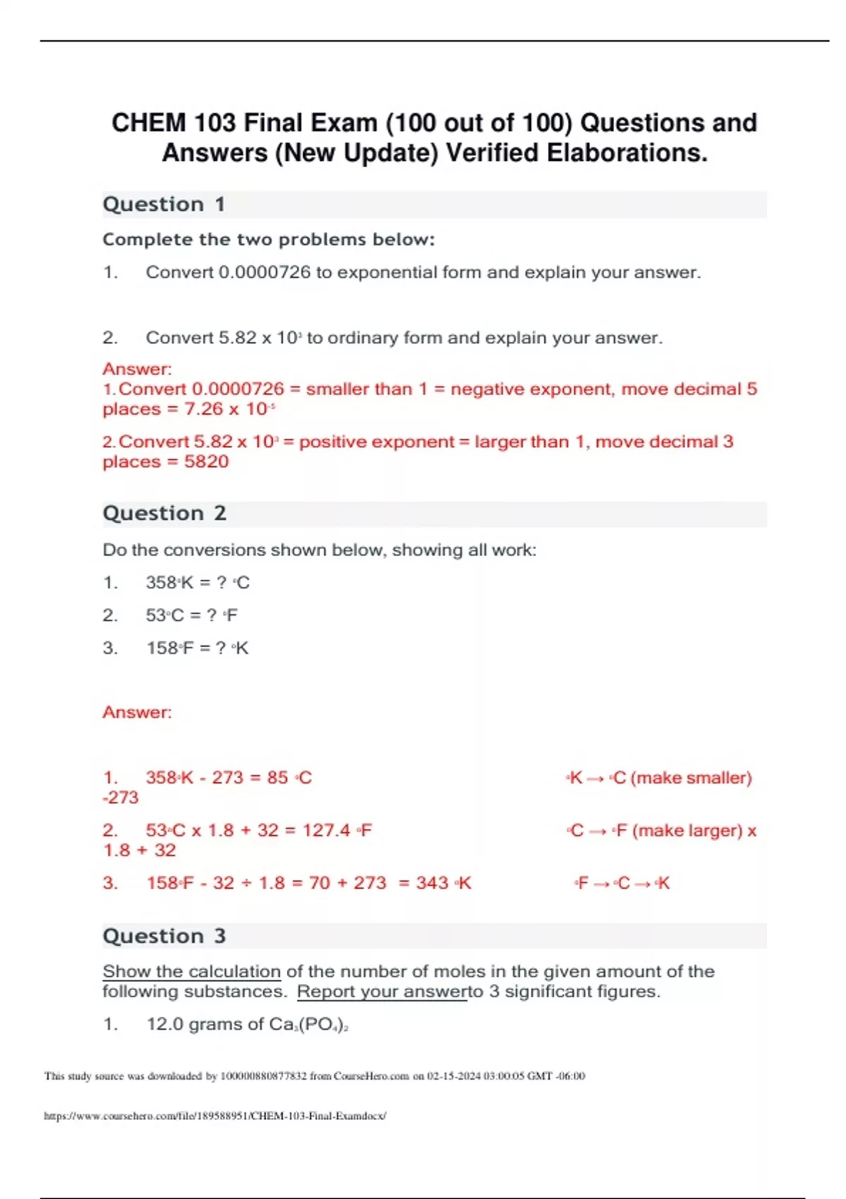 CHEM 103 Final Exam (100 out of 100) Questions and Answers (New Update)| 100% Correct| Grade A
