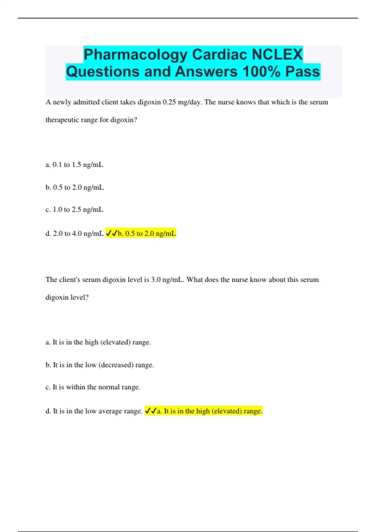 Pharmacology Cardiac NCLEX Questions and Answers 100% Pass A newly admitted client takes digoxin 0.25 mg/day. The nurse knows that which is the serum therapeutic range for digoxin? a. 0.1 to 1.5 ng/mL b. 0.5 to 2.0 ng/mL c. 1.0 to 2.5 ng/mL d. 2.0 to 4.0 ng/mL b. 0.5 to 2.0 ng/mL The client's serum digoxin level is 3.0 ng/mL. What does the nurse know about this serum digoxin level? a. It is in the high (elevated) range. b. It is in the low (decreased) range. c. It is within the normal range. d. It is in the low average range. a. It is in the high (elevated) range. The client is also taking a diuretic that decreases her potassium level. The nurse expects that a low potassium level (hypokalemia) could have what effect on the digoxin? a. Increase the serum digoxin sensitivity level b. Decrease the serum digoxin sensitivity level c. Not have any effect on the serum digoxin sensitivity level d. Cause a low average serum digoxin sensitivity level a. Increase the serum digoxin sensitivity level When a client first takes a nitrate, the nurse expects which symptom that often occurs? a. Nausea and vomiting b. Headaches c. Stomach cramps d. Irregular pulse rate b. Headaches The nurse acknowledges that beta blockers are as effective as antianginals because they do what? a. Increase oxygen to the systemic circulation. b. Maintain heart rate and blood pressure. c. Decrease heart rate and decrease myocardial contractility. d. Decrease heart rate and increase myocardial contractility. c. Decrease heart rate and decrease myocardial contractility. The health care provider is planning to discontinue a client's beta blocker. What instruction should the nurse give the client regarding the beta blocker? a. The beta blocker should be abruptly stopped when another cardiac drug is prescribed. b. The beta blocker should NOT be abruptly stopped; the dose should be tapered down. c. The beta blocker dose should be maintained while taking another antianginal drug. d. Half the beta blocker dose should be taken for the next several weeks. b. The beta blocker should NOT be abruptly stopped; the dose should be tapered down. The beta blocker acebutolol (Sectral) is prescribed for dysrhythmias. The nurse knows that what is the primary purpose of the drug? a. To increase the beta1 and beta2 receptors in the cardiac tissues b. To increase the flow of oxygen to the cardiac tissues c. To block the beta1-adrenergic receptors in the cardiac tissues d. To block the beta2-adrenergic receptors in the cardiac tissues c. To block the beta1- adrenergic receptors in the cardiac tissues A client is to be discharged home with a transdermal nitroglycerin patch. Which instruction will the nurse include in the client's teaching plan? a. "Apply the patch to a nonhairy area of the upper torso or arm." b. "Apply the patch to the same site each day." c. "If you have a headache, remove the patch for 4 hours and then reapply." d. "If you have chest pain, apply a second patch next to the first patch." a. "Apply the patch to a nonhairy area of the upper torso or arm." A nurse is monitoring a client with angina for therapeutic effects of nitroglycerin. Which assessment finding indicates that the nitroglycerin has been effective? a. Blood pressure 120/80 mm Hg b. Heart rate 70 beats per minute c. ECG without evidence of ST changes d. Client stating that pain is 0 out of 10 d. Client stating that pain is 0 out of 10 The nurse is monitoring a client during IV nitroglycerin infusion. Which assessment finding will cause the nurse to take action? a. Blood pressure 110/90 mm Hg b. Flushing c. Headache d. Chest pain d. Chest pain Which statement made by the client demonstrates a need for further instruction regarding the use of nitroglycerin? a. "If I get a headache, I should keep taking nitroglycerin and use Tylenol for pain relief." b. "I should keep my nitroglycerin in a cool, dry place." c. "I should change positions slowly to avoid getting dizzy." d. "I can take up to five tablets at 3-minute intervals for chest pain if necessary." d. "I can take up to five tablets at 3-minute intervals for chest pain if necessary." Which client assessment would assist the nurse in evaluating therapeutic effects of a calcium channel blocker? a. Client states that she has no chest pain. b. Client states that the swelling in her feet is reduced.