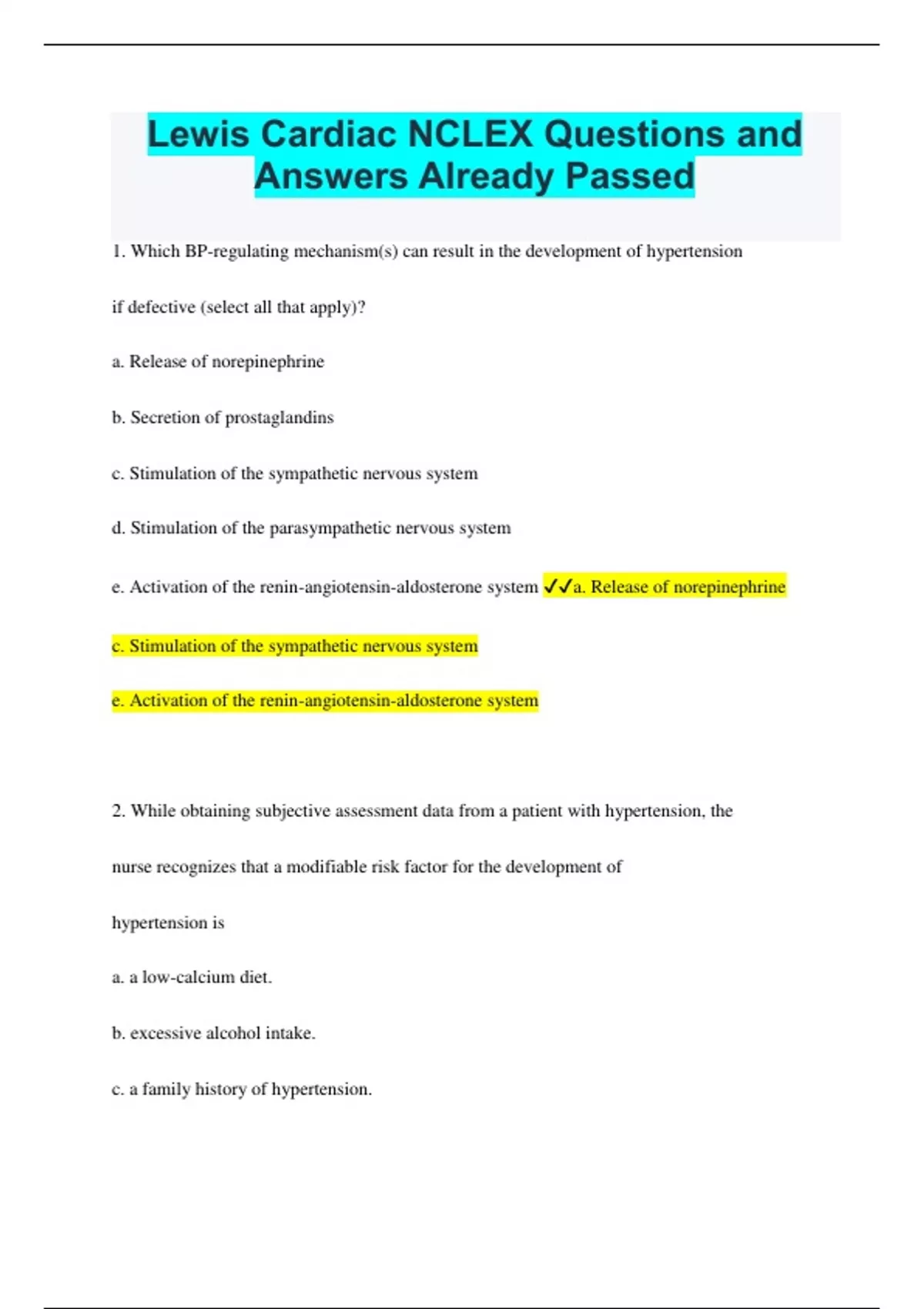 Lewis Cardiac NCLEX Questions and Answers Already Passed 1. Which BP-regulating mechanism(s) can result in the development of hypertension if defective (select all that apply)? a. Release of norepinephrine b. Secretion of prostaglandins c. Stimulation of the sympathetic nervous system d. Stimulation of the parasympathetic nervous system e. Activation of the renin-angiotensin-aldosterone system a. Release of norepinephrine c. Stimulation of the sympathetic nervous system e. Activation of the renin-angiotensin-aldosterone system 2. While obtaining subjective assessment data from a patient with hypertension, the nurse recognizes that a modifiable risk factor for the development of hypertension is a. a low-calcium diet. b. excessive alcohol intake. c. a family history of hypertension. d. consumption of a high-protein diet. b. excessive alcohol intake. 3. In teaching a patient with hypertension about controlling the illness, the nurse recognizes that a. all patients with elevated BP require medication. b. obese persons must achieve a normal weight to lower BP. c. it is not necessary to limit salt in the diet if taking a diuretic. d. lifestyle modifications are indicated for all persons with elevated BP. d. lifestyle modifications are indicated for all persons with elevated BP. 4. A priority consideration in the management of the older adult with hypertension is to a. prevent primary hypertension from converting to secondary hypertension. b. recognize that the older adult is less likely to adhere to the drug therapy regimen than a younger adult. c. ensure that the patient receives larger initial doses of antihypertensive drugs because of impaired absorption. d. use careful technique in assessing the BP of the patient because of the possible presence of an auscultatory gap. d. use careful technique in assessing the BP of the patient because of the possible presence of an auscultatory gap. 5. A patient with newly discovered high BP has an average reading of 158/98 mm Hg after 3 months of exercise and diet modifications. Which management strategy will be a priority for this patient? a. Medication will be required because the BP is still not at goal. b. BP monitoring should continue for another 3 months to confirm a diagnosis of hypertension. c. Lifestyle changes are less important, since they were not effective, and medications will be started. d. More vigorous changes in the patient's lifestyle are needed for a longer time before starting medications. a. Medication will be required because the BP is still not at goal. 6. A patient is admitted to the hospital in hypertensive emergency (BP 244/142 mm Hg). Sodium nitroprusside is started to treat the elevated BP. Which management strategy(ies) would be most appropriate for this patient (select all that apply)? a. Measuring hourly urine output b. Decreasing the MAP by 50% within the first hour c. Continuous BP monitoring with an arterial line d. Maintaining bed rest and providing tranquilizers to lower the BP e. Assessing the patient for signs and symptoms of heart failure and changes in mental status a. Measuring hourly urine output c. Continuous BP monitoring with an arterial line e. Assessing the patient for signs and symptoms of heart failure and changes in mental status 1. A patient with a tricuspid valve disorder will have impaired blood flow between the a. vena cava and right atrium. b. left atrium and left ventricle. c. right atrium and right ventricle. d. right ventricle and pulmonary artery. c.