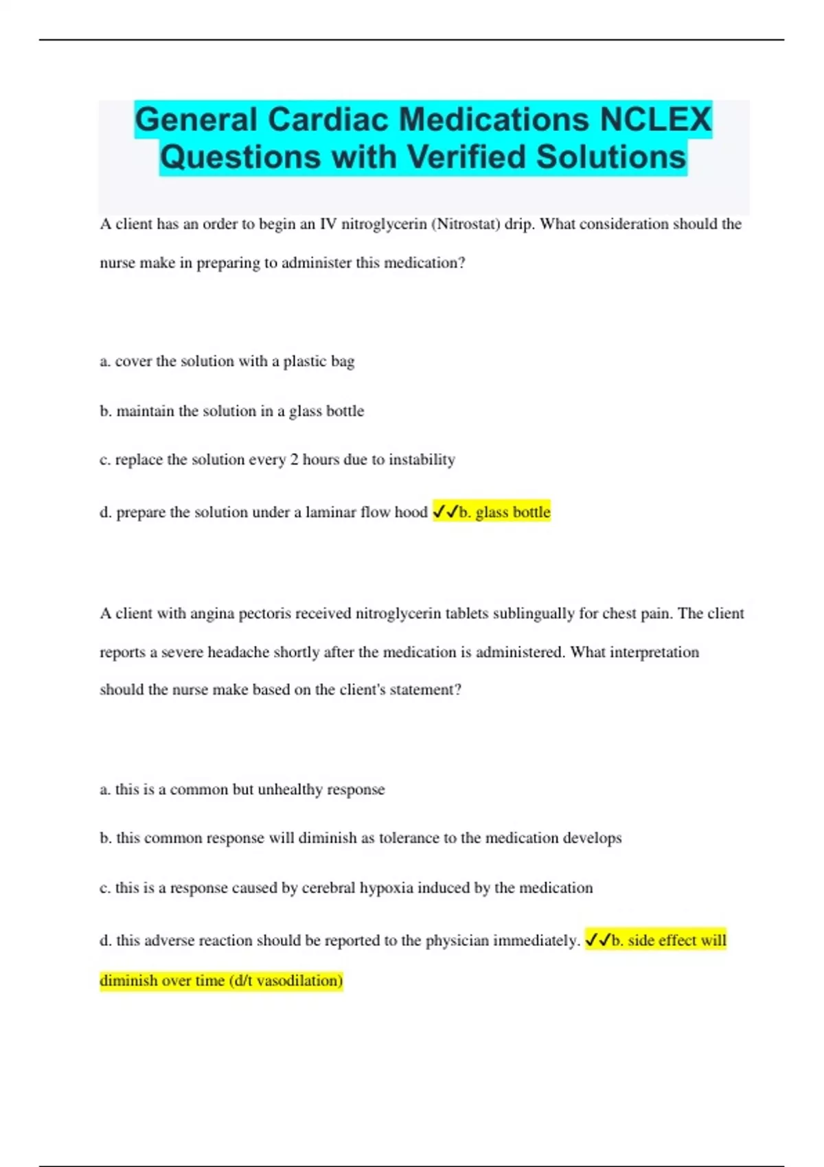 General Cardiac Medications NCLEX Questions with Verified Solutions A client has an order to begin an IV nitroglycerin (Nitrostat) drip. What consideration should the nurse make in preparing to administer this medication? a. cover the solution with a plastic bag b. maintain the solution in a glass bottle c. replace the solution every 2 hours due to instability d. prepare the solution under a laminar flow hood b. glass bottle A client with angina pectoris received nitroglycerin tablets sublingually for chest pain. The client reports a severe headache shortly after the medication is administered. What interpretation should the nurse make based on the client's statement? a. this is a common but unhealthy response b. this common response will diminish as tolerance to the medication develops c. this is a response caused by cerebral hypoxia induced by the medication d. this adverse reaction should be reported to the physician immediately. b. side effect will diminish over time (d/t vasodilation) diltiazem (Cardizem) is Rx for a client with chronic, stable angina. Which statement by the client indicates to the clinic nurse that the client needs additional medication information? a. I will call the physician is SHOB occurs b. I will rise slowly when getting out of bed c. I will take the medication after meals d. I may notice changes in mental alertness until my dose is regulated c. administer before meals and at bedtime to increase absorption A diabetic client newly diagnosed with hypertension also smokes. The nurse would question an order for which antihypertensive medication? a. diltiazem (Cardizem) b. propranolol (Inderal) c. prazosin (Minipress) d. furosemide (Lasix) b. propranolol is a beta blocker, adverse effects include: bronchospasm, mask hypoglycemia attacks. The nurse has given medication instructions to the client receiving nicardipine (Cardene) for angina. What statement by the client would indicate to the nurse that the teaching needs to be reinforced? a. I will keep track of angina episodes, and report them if they increase b. edema or weight gain are expected side effects of the medication c. I will report a pulse rate of fewer than 50 bp d. I will take any missed dose as soon as remembered, unless it is almost time for the next dose b. this drug is a calcium channel blocker, edema or weight gain could be signs of heart failure A client with hypertension has been given a Rx to treat the disorder. The nurse should explain that cough and loss of taste are side effects if which antihypertensive agent has been Rx? a. lisinopril (Prinivil) b. propranolol (Inderal) c. diltiazem (Cardizem) d. furosemide (Lasix) a. cough and loss of taste are common side effects of ACE inhibitors The physician Rx lasartan (Cozaar) for a client with hypertension. The nurse carrying out the order explains to the client that this medication promotes vasodilation by which action? a. preventing calcium from going into the cells b. promoting epinephrine and norepinephrine c. promoting release of aldosterone d. inhibiting conversion of a substance that would cause vasoconstriction d. angiotension II antagonist that inhibits the conversion of AT I to AT II. AT II is a powerful vasoconstrictor. A client with hypertension monitors his