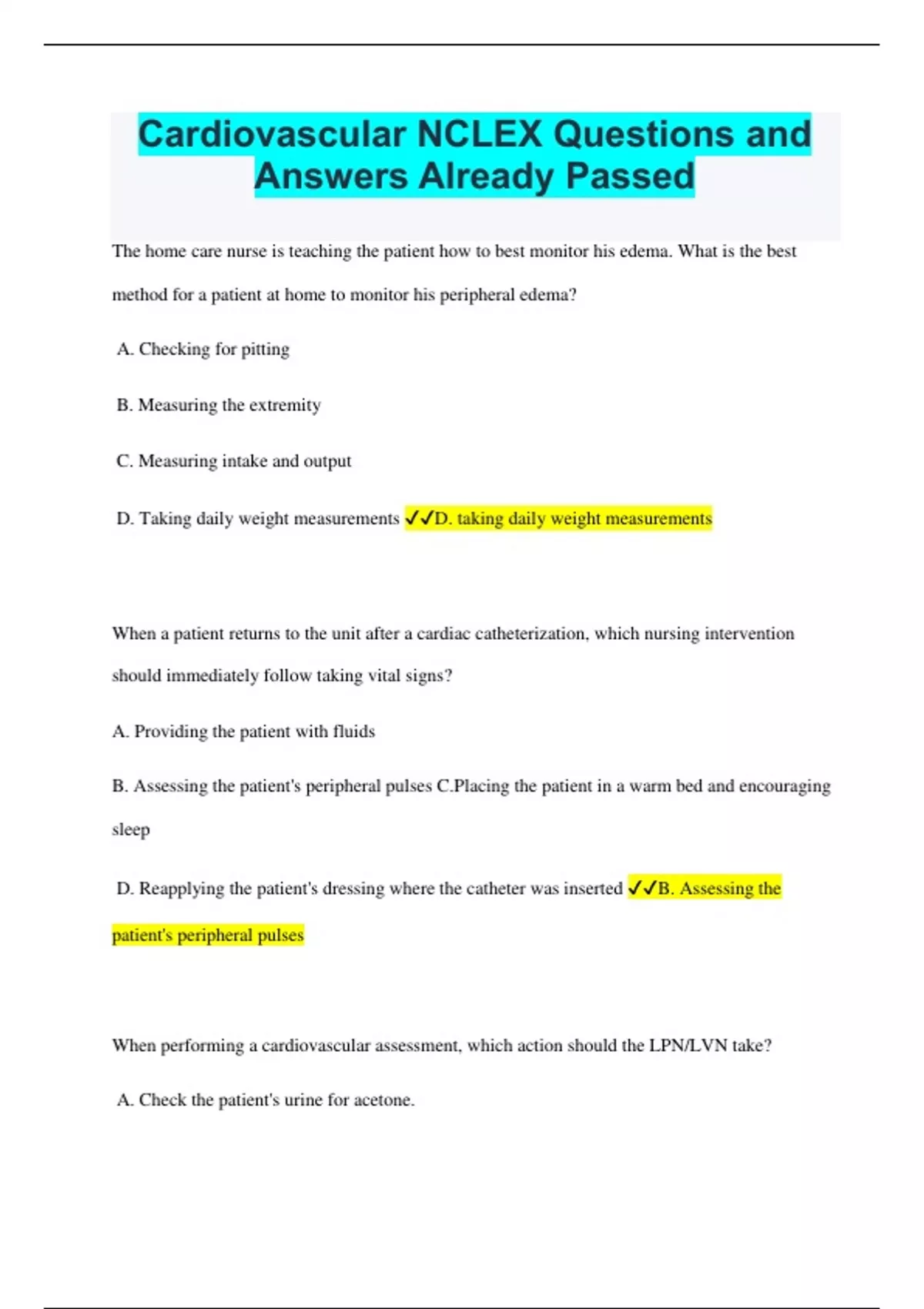Cardiovascular NCLEX Questions and Answers Already Passed The home care nurse is teaching the patient how to best monitor his edema. What is the best method for a patient at home to monitor his peripheral edema? A. Checking for pitting B. Measuring the extremity C. Measuring intake and output D. Taking daily weight measurements D. taking daily weight measurements When a patient returns to the unit after a cardiac catheterization, which nursing intervention should immediately follow taking vital signs? A. Providing the patient with fluids B. Assessing the patient's peripheral pulses C.Placing the patient in a warm bed and encouraging sleep D. Reapplying the patient's dressing where the catheter was inserted B. Assessing the patient's peripheral pulses When performing a cardiovascular assessment, which action should the LPN/LVN take? A. Check the patient's urine for acetone. B. Obtain a sputum specimen from the patient. C. Find out whether the patient is the youngest in the family. D. Assess the patient's apical pulse rate and rhythm, noting the presence of pulse deficit. D. Assess the patient's apical pulse rate and rhythm, noting the presence of pulse deficit. The nurse is caring for a patient following an angiogram. Which action should the nurse include in the patient's care? A. Encourage restriction of fluid intake B. Assess for allergies to radiopaque dye C. Have the patient refrain from coughing D. Instruct the patient about ways to combat constipation B. Assess for allergies to radiopaque dye The nurse is providing education to a patient in the clinic for his annual examination on cardiovascular health. Which of these factors, if present in the patient's history, are most closely related to the development of arteriosclerosis? A. The patient is an accountant. B. The patient has diabetes mellitus. C. The patient is to receive chemotherapy. D. The patient had rheumatic fever as a child. B. The patient has diabetes mellitus. The nurse is assessing a patient who states he has been diagnosed with intermittent claudication. The nurse anticipates that the patient's cramping pain will be brought on by what activity or position? A. Exercise B. Standing in one place C.Having an extremity in dependent position D. Having an extremity above the level of the heart A. Exercise When a patient has altered tissue perfusion, which intervention should be included in the patient's care? A. Keep the patient's environment on the cool side. B. Instruct the patient to avoid extremes of temperature. C. Use local applications of heat, such as hot water bottles. D. Instruct the patient to wear underclothing made of elastic materials. B. Instruct the patient to avoid extremes of temperature. The patient who is scheduled for a nuclear (thallium) imaging scan asks the nurse about the purpose of this test. Which response by the LPN/LVN is correct? A. "This test measures the electrical activity within the heart." B. "This test evaluates blood flow in various parts of the heart." C. "This test determines the pressure in various chambers of the heart." D. "This test provides visual information about the interior of a coronary artery." B. "This test evaluates blood flow in various parts of the heart." A patient is scheduled for cardiac catheterization this morning. Before the procedure can be started, what must be accomplished? (Select all that apply.) A. Assess renal status. B. Evaluate any difficulty swallowing. C. Determine if the patient has a history of claustrophobia. D. Assess the patient's allergy status, especially related to iodine. E. The physician must obtain informed consent for the procedure from the patient. A. Assess renal status. D. Assess the patient's allergy status, especially related to iodine. E. The physician must obtain informed consent for the procedure from the patient. ID: