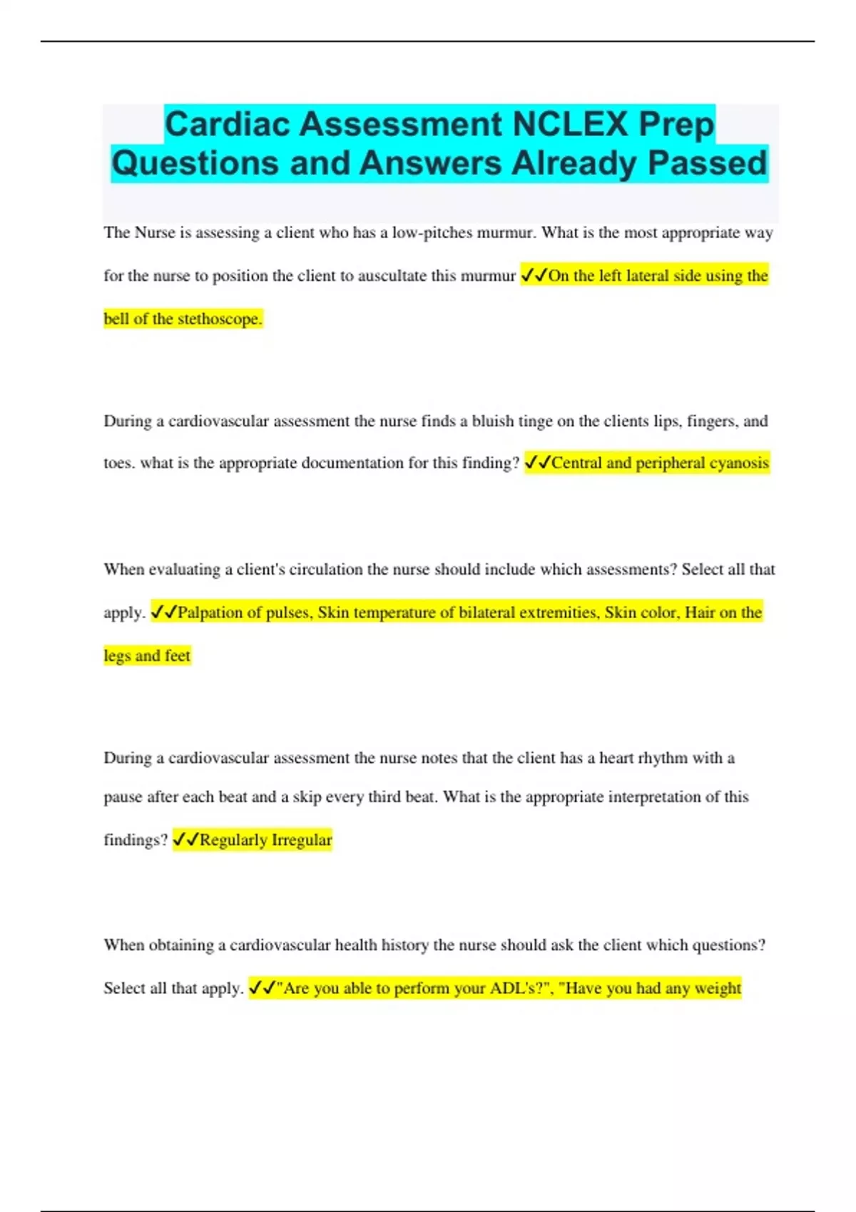 Cardiac Assessment NCLEX Prep Questions and Answers Already Passed