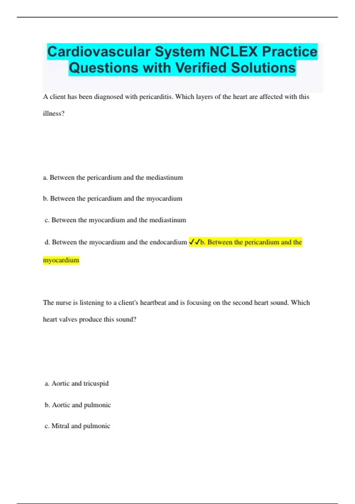 Cardiovascular System NCLEX Practice Questions with Verified Solutions A client has been diagnosed with pericarditis. Which layers of the heart are affected with this illness? a. Between the pericardium and the mediastinum b. Between the pericardium and the myocardium c. Between the myocardium and the mediastinum d. Between the myocardium and the endocardium b. Between the pericardium and the myocardium The nurse is listening to a client's heartbeat and is focusing on the second heart sound. Which heart valves produce this sound? a. Aortic and tricuspid b. Aortic and pulmonic c. Mitral and pulmonic d. Mitral and tricuspid b. Aortic and pulmonic The nurse hears a heart sound right before S1 on a 72-year-old male client. What can this finding suggest to the nurse? a. Nothing. This is normal. b. This is an atrial kick and helps the heart beat better. c. This is an atrial gallop and can mean something is wrong. d. This is a ventricular gallop and is heard in healthy people. c. This is an atrial gallop and can mean something is wrong. An S4 heard before S1 is termed an atrial gallop and may be associated with pathologic conditions such as myocardial infarction or heart failure. The nurse hears a heart murmur on a client and wants to grade this soft but very audible sound. How should this heart murmur be described? a. Grade 3 b. Grade 2 c. Grade 4 d. Grade 1 b. Grade 2 A client has been diagnosed with a myocardial infarction that has damaged a part of the right atrium. Which of the following could happen as a result of this damage? a. Increase in collateral circulation b. Nothing c. A change in the rate and rhythm of the client's heartbeat d. Onset of aortic regurgitation c. A change in the rate and rhythm of the client's heartbeat A nurse, explaining the cardiac circulation to cardiac rehabilitation clients, wants to include the oxygenation of the heart muscle. Which of the following structures carries deoxygenated blood to the lungs? a. Right main coronary vein b. Pulmonary vein c. Pulmonary artery d. Great cardiac vein c. Pulmonary artery The nurse notes a client's PR interval upon ECG is greater than 0.20 seconds. What can this information suggest to the nurse?