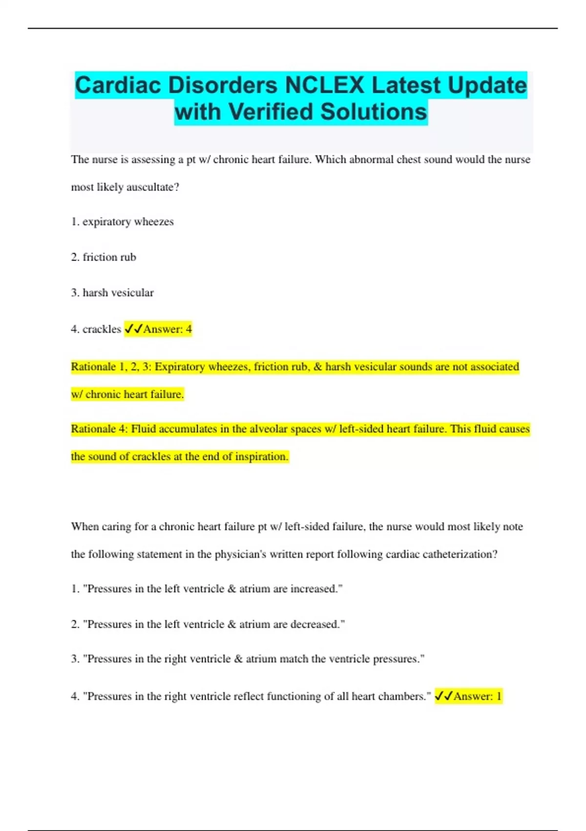 Cardiac Disorders NCLEX Latest Update with Verified Solutions The nurse is assessing a pt w/ chronic heart failure. Which abnormal chest sound would the nurse most likely auscultate? 1. expiratory wheezes 2. friction rub 3. harsh vesicular 4. crackles Answer: 4 Rationale 1, 2, 3: Expiratory wheezes, friction rub, & harsh vesicular sounds are not associated w/ chronic heart failure. Rationale 4: Fluid accumulates in the alveolar spaces w/ left-sided heart failure. This fluid causes the sound of crackles at the end of inspiration. When caring for a chronic heart failure pt w/ left-sided failure, the nurse would most likely note the following statement in the physician's written report following cardiac catheterization? 1. "Pressures in the left ventricle & atrium are increased." 2. "Pressures in the left ventricle & atrium are decreased." 3. "Pressures in the right ventricle & atrium match the ventricle pressures." 4. "Pressures in the right ventricle reflect functioning of all heart chambers." Answer: 1 Rationale 1: As the heart loses its ability to eject blood effectively from the left ventricle upon contraction, blood is retained in the left ventricle after systole & the chamber pressure rises due to the added blood volume. Rationale 2: As the heart loses its ability to eject blood effectively from the left ventricle upon contraction, blood is retained in the left ventricle after systole & the chamber pressure rises due to the added blood volume. Rationale 3: This pt is in left-sided heart failure, so pressure is higher in the left side of the heart, not the right side. Rationale 4: This pt is in left-sided heart failure, so pressure is higher in the left side of the heart, not the right side. A nurse caring for a pt w/ heart failure would expect to find which of the following during assessment of the pt? 1. S1, S2 & flat neck veins 2. S3 & distended neck veins 3. S2 is heard the loudest & followed by S1 4. S4 & flat neck veins Answer: 2 Rationale 1: S1 & S2 are normal heart sounds; flat neck veins are considered a normal finding. Rationale 2: The abnormal S3 sound is reflective of the heart's attempts to fill an already distended ventricle & the neck veins distend because of the increased venous pressure. Rationale 3: S1 & S2 sounds may be diminished in the heart failure pt & not vary in intensity. Rationale 4: S4 (gallop) may be present but neck veins would be distended. When obtaining the health history of a pt who is being assessed for possible congestive heart failure, it is significant when the pt says which of the following? 1. "I break out in a cold sweat when I eat a large meal." 2. "I am sleepy after I eat lunch each day." 3. "I have to prop myself up on three pillows to sleep at night, otherwise I can't breathe." 4. "I feel better w/ my legs down when I sit in my favorite chair." Answer: 3 Rationale 1: Diaphoresis & sleepiness after meals & comfort when legs are dependent are all notable findings but not related to a diagnosis of CHF. Rationale 2: Diaphoresis & sleepiness after meals & comfort when legs are dependent are all notable findings but not related to a diagnosis of CHF. Rationale 3: Needing to prop oneself up w/ pillows at night in order to breathe describes orthopnea, which is consistent w/ congestive heart failure (CHF). Congestive heart failure produces a volume excess, congestion in the lungs, & dyspnea when attempting to lie down. Rationale 4: Diaphoresis & sleepiness after meals & comfort when legs are dependent are all notable findings but not related to a diagnosis of CHF. A pt is admitted w/ acute heart failure. The nurse realizes that acute heart failure is associated w/ an abrupt onset of which of the following? Select all that apply. 1. cardiomyopathy 2. heart valve disease 3. coronary heart disease (CHD) 4. massive infarction (MI)) 5. myocardial injury Correct Answer: 4,5 Rationale 1,2,3: Cardiomyopathy, valve disease, & coronary heart disease (CHD) are all associated w/ chronic heart failure. Rationale 4,5: Pts often present for care w/ signs of acute heart failure when they have had an abrupt onset of myocardial injury such as a massive myocardial infarction (MI). Blood tests are ordered for a pt who is diagnosed w/ possible congestive heart failure (CHF). The nurse underst&s which of the following lab tests indicates heart failure? The most specific test(s) to accurately indicate CHF would be which of the following? 1. liver function 2. urinalysis & blood urea nitrogen (BUN)