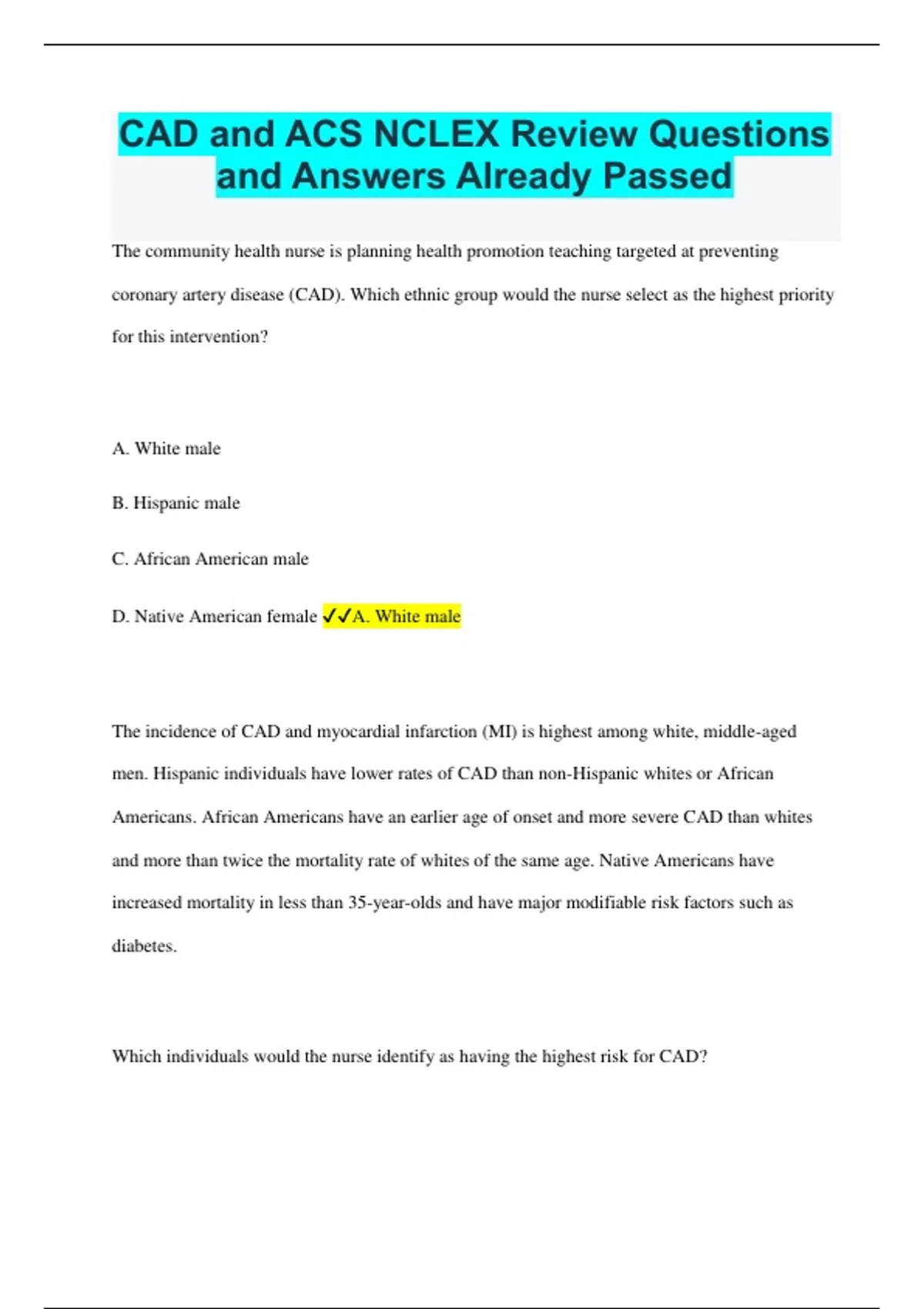 CAD and ACS NCLEX Review Questions and Answers Already Passed The community health nurse is planning health promotion teaching targeted at preventing coronary artery disease (CAD). Which ethnic group would the nurse select as the highest priority for this intervention? A. White male B. Hispanic male C. African American male D. Native American female A. White male The incidence of CAD and myocardial infarction (MI) is highest among white, middle-aged men. Hispanic individuals have lower rates of CAD than non-Hispanic whites or African Americans. African Americans have an earlier age of onset and more severe CAD than whites and more than twice the mortality rate of whites of the same age. Native Americans have increased mortality in less than 35-year-olds and have major modifiable risk factors such as diabetes. Which individuals would the nurse identify as having the highest risk for CAD? A. A 45-year-old depressed male with a high-stress job B. A 60-year-old male with below normal homocysteine levels C. A 54-year-old female vegetarian with elevated high-density lipoprotein (HDL) levels D. A 62-year-old female who has a sedentary lifestyle and body mass index (BMI) of 23 kg/m2 A. A 45-year-old depressed male with a high-stress job The 45-year-old depressed male with a high-stress job is at the highest risk for CAD. Studies demonstrate that depression and stressful states can contribute to the development of CAD. Elevated HDL levels and low homocysteine levels actually help to prevent CAD. Although a sedentary lifestyle is a risk factor, a BMI of 23 kg/m2 depicts normal weight, and thus the patient with two risk factors is at greatest risk for developing CAD. When providing nutritional counseling for patients at risk for CAD, which foods would the nurse encourage patients to include in their diet (select all that apply)? A. Tofu B. Walnuts C. Tuna fish D. Whole milk E. Orange juice A, B, C. Tuna fish, tofu, and walnuts are all rich in omega-3 fatty acids, which have been shown to reduce the risks associated with CAD when consumed regularly. Which antilipemic medications should the nurse question for a patient with cirrhosis of the liver (select all that apply)? A. Niacin (Nicobid) B. Ezetimibe (Zetia) C. Gemfibrozil (Lopid) D. Atorvastatin (Lipitor) E. Cholestyramine (Questran) B, D. Ezetimibe (Zetia) should not be used by patients with liver impairment. Adverse effects of atorvastatin (Lipitor), a statin drug, include liver damage and myopathy. Liver enzymes must be monitored frequently and the medication stopped if these enzymes increase. Niacin's side effects subside with time, although decreased liver function may occur with high doses. Cholestyramine is safe for long-term use.