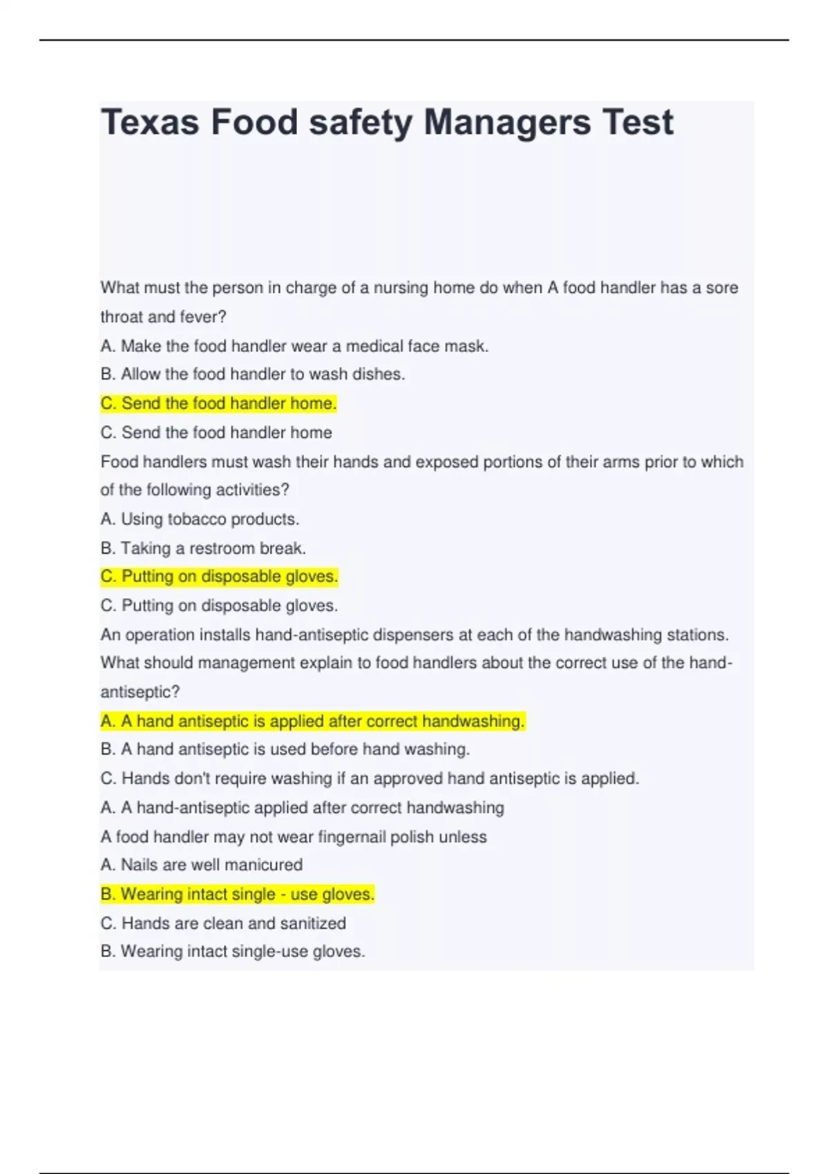 Texas Food safety Managers Test What must the person in charge of a nursing home do when A food handler has a sore throat and fever? A. Make the food handler wear a medical face mask. B. Allow the food handler to wash dishes. C. Send the food handler home. C. Send the food handler home Food handlers must wash their hands and exposed portions of their arms prior to which of the following activities? A. Using tobacco products. B. Taking a restroom break. C. Putting on disposable gloves. C. Putting on disposable gloves. An operation installs hand-antiseptic dispensers at each of the handwashing stations. What should management explain to food handlers about the correct use of the handantiseptic? A. A hand antiseptic is applied after correct handwashing. B. A hand antiseptic is used before hand washing. C. Hands don't require washing if an approved hand antiseptic is applied. A. A hand-antiseptic applied after correct handwashing A food handler may not wear fingernail polish unless A. Nails are well manicured B. Wearing intact single - use gloves. C. Hands are clean and sanitized B. Wearing intact single-use gloves. The person in charge must exclude the food handler when he or she reports having which symptom? A. Yellow skin and eyes B. Infected lesion. C. Sore throat with fever A. Yellow skin and eyes