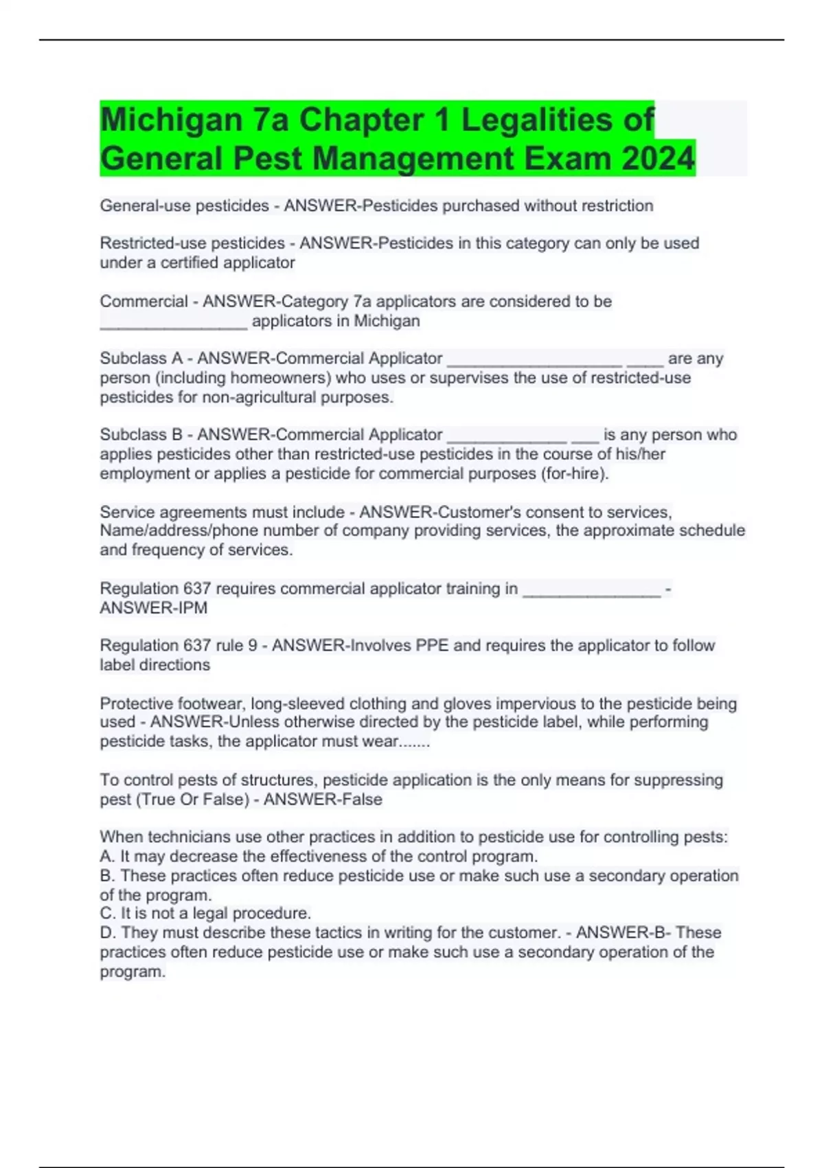 Michigan 7a Chapter 1 Legalities of General Pest Management Exam 2024