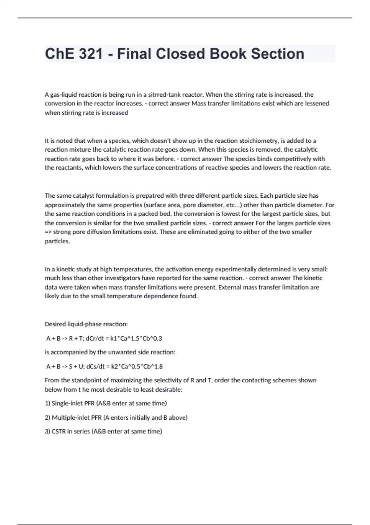 ChE 321 - Final Closed Book Section with answers 2024/2025