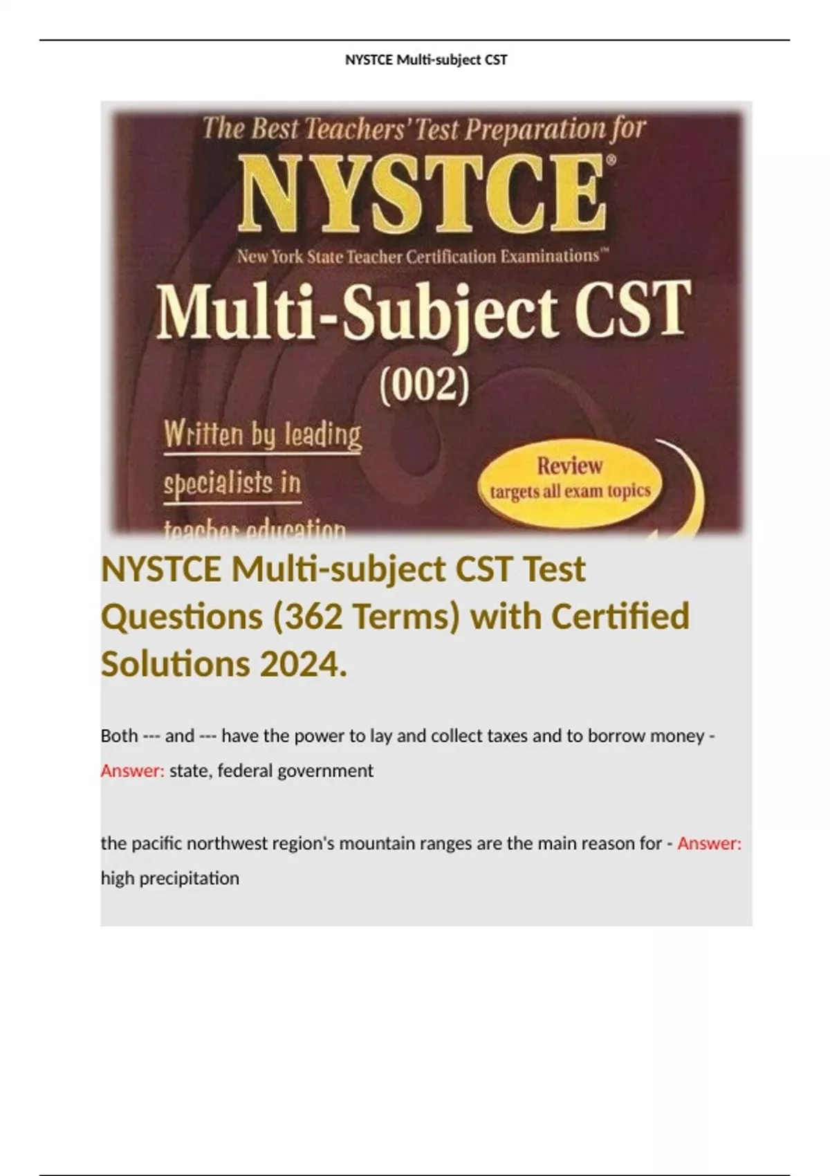 NYSTCE Multi-subject CST Test Questions (362 Terms) with Certified Solutions 2024.