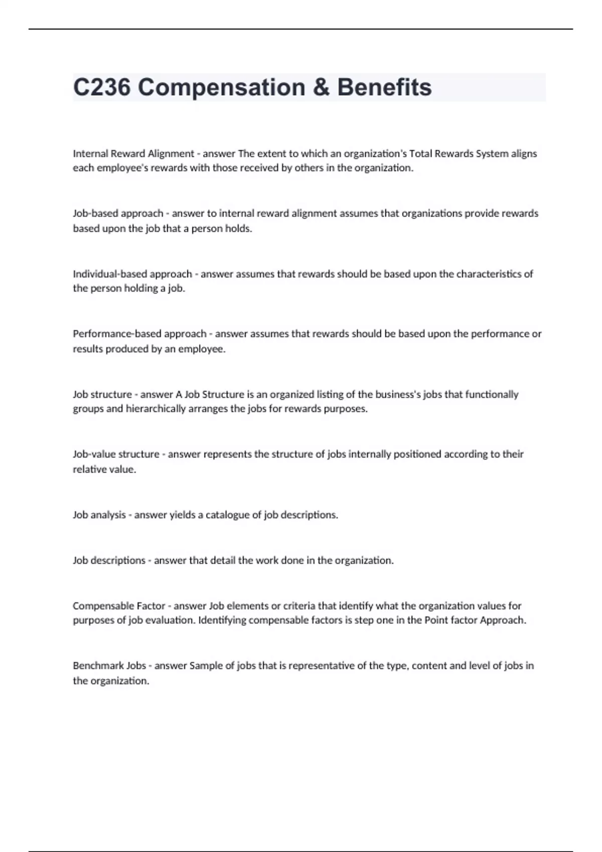 C236 Compensation & BenefitsInternal Reward Alignment - answer The extent to which an organization's Total Rewards System aligns each employee's rewards with those received by others in the organization. Job-based approach - answer to internal reward alignment assumes that organizations provide rewards based upon the job that a person holds. Individual-based approach - answer assumes that rewards should be based upon the characteristics of the person holding a job. Performance-based approach - answer assumes that rewards should be based upon the performance or results produced by an employee. Job structure - answer A Job Structure is an organized listing of the business's jobs that functionally groups and hierarchically arranges the jobs for rewards purposes. Job-value structure - answer represents the structure of jobs internally positioned according to their relative value. Job analysis - answer yields a catalogue of job descriptions. Job descriptions - answer that detail the work done in the organization. Compensable Factor - answer Job elements or criteria that identify what the organization values for purposes of job evaluation. Identifying compensable factors is step one in the Point factor Approach. Benchmark Jobs - answer Sample of jobs that is representative of the type, content and level of jobs in the organization.