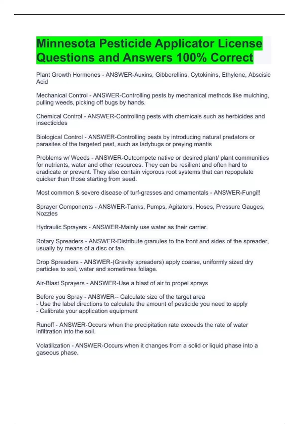 Minnesota Pesticide Applicator License Questions and Answers 100% Correct