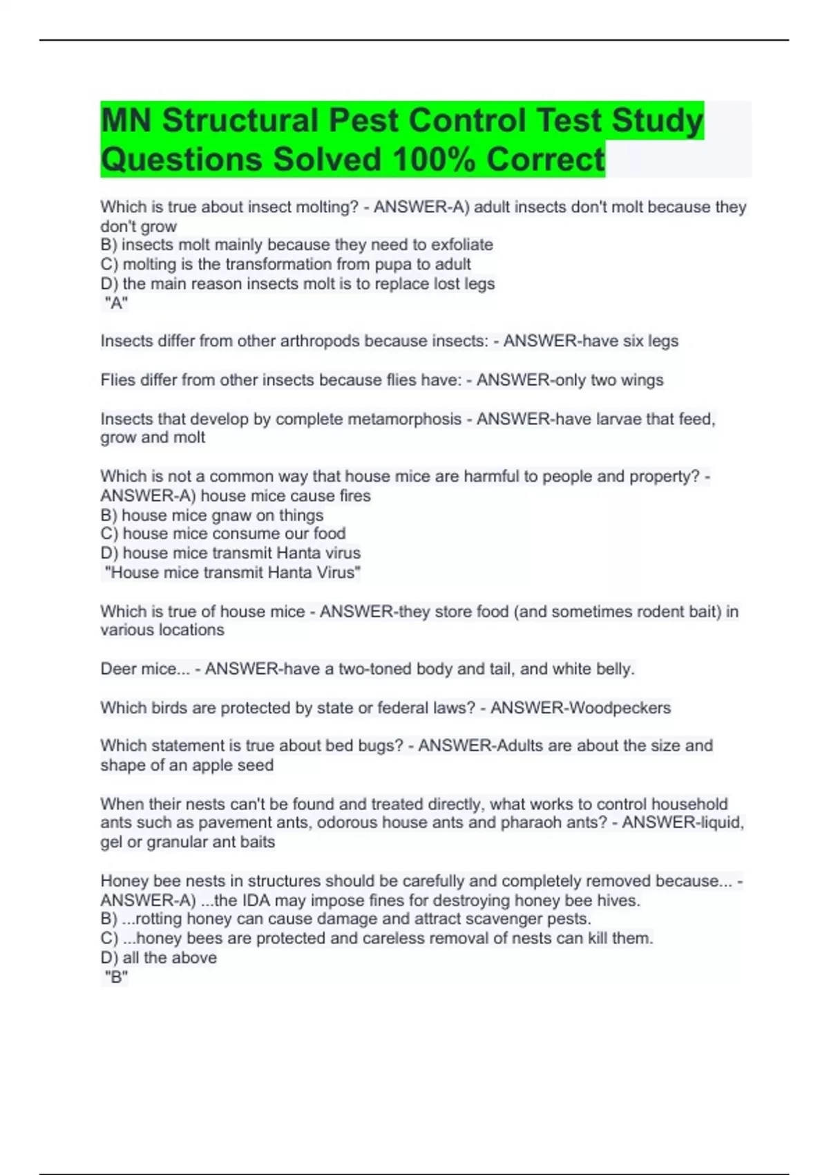 MN Structural Pest Control Test Study Questions Solved 100% Correct