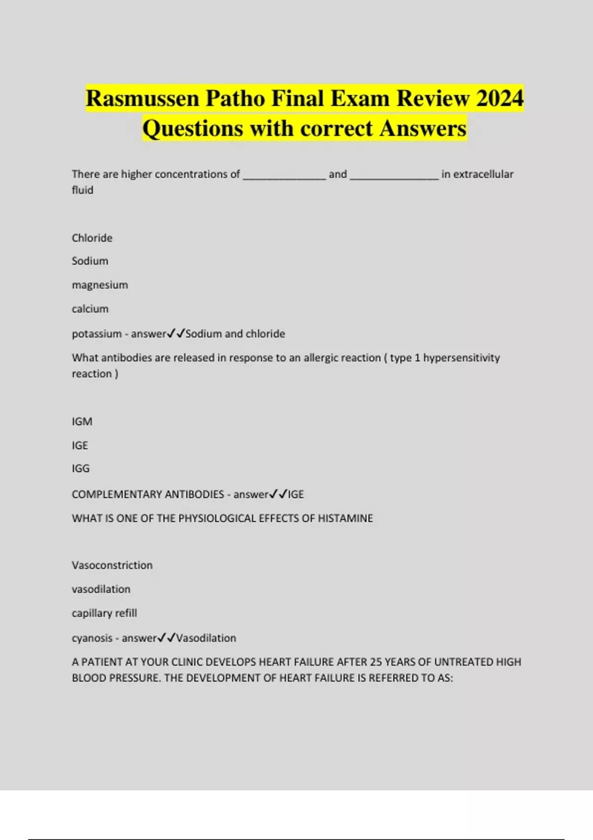 Rasmussen Patho Final Exam Review 2024 Questions with correct Answers There are higher concentrations of ______________ and _______________ in extracellular fluid Chloride Sodium magnesium calcium potassium - answerSodium and chloride What antibodies are released in response to an allergic reaction ( type 1 hypersensitivity reaction ) IGM IGE IGG COMPLEMENTARY ANTIBODIES - answerIGE WHAT IS ONE OF THE PHYSIOLOGICAL EFFECTS OF HISTAMINE Vasoconstriction vasodilation capillary refill cyanosis - answerVasodilation A PATIENT AT YOUR CLINIC DEVELOPS HEART FAILURE AFTER 25 YEARS OF UNTREATED HIGH BLOOD PRESSURE. THE DEVELOPMENT OF HEART FAILURE IS REFERRED TO AS: CHRONIC HEART DISEASE COMPLICATED HYPERTENSION SEQUELA MANIFESTATIONS OF UNDERLYING HEART DISEASE - answerSequela IF A client has a potassium LEVEL of 1.9 mEq/L what assessment would you want to complete immediately? Assess for jaundice Assess for skin turgor Assess the client's ability to walk without a cane Assess the telemetry/EKG for cardiac abnormalities - answerAssess the telemetry/EKG for cardiac abnormalities Which primary stimulus for the sensation of thirst declines with aging ? Altered renal GFR Increased circulating blood volume Altered metabolism Increased serum osmolality - answerIncreased serum osmolarity A patient has edema. What could have caused the edema? Increased interstitial fluid osmotic pressure Overuse of potassium-wasting diuretic medication Hypernatremia combined with fluid volume deficit Excessive production of A- and B-type natriuretic peptides - answerIncreased interstitial fluid osmotic pressure Which of the following electrolyte imbalances result in increased neuromuscular activity? Hypernatremia Hypermagnesemia Hypercalcemia Hyperphosphatemia - answerHyperphosphatemia Which mechanism can cause antimicrobial resistance? Enhancing chemotaxis which moves the drug Producing enzymes that inactivate the drug Enhancing herd immunity which protects against the drug Producing helminthes that actively repel the drug - answerProducing enzymes that inactivate the drug Which term should be used when descri