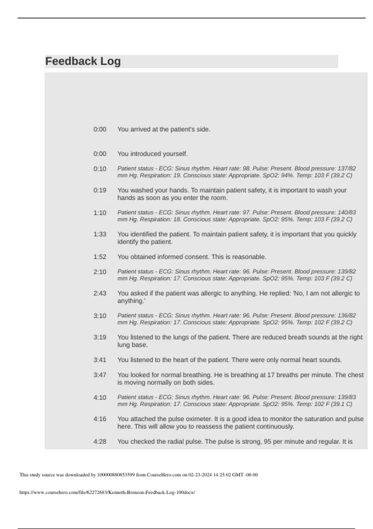 Feedback Log 0:00 You arrived at the patient's side. 0:00 You introduced yourself. 0:10 Patient status - ECG: Sinus rhythm. Heart rate: 98. Pulse: Present. Blood pressure: 137/82 mm Hg. Respiration: 19. Conscious state: Appropriate. SpO2: 94%. Temp: 103 F (39.2 C) 0:19 You washed your hands. To maintain patient safety, it is important to wash your hands as soon as you enter the room. 1:10 Patient status - ECG: Sinus rhythm. Heart rate: 97. Pulse: Present. Blood pressure: 140/83 mm Hg. Respiration: 18