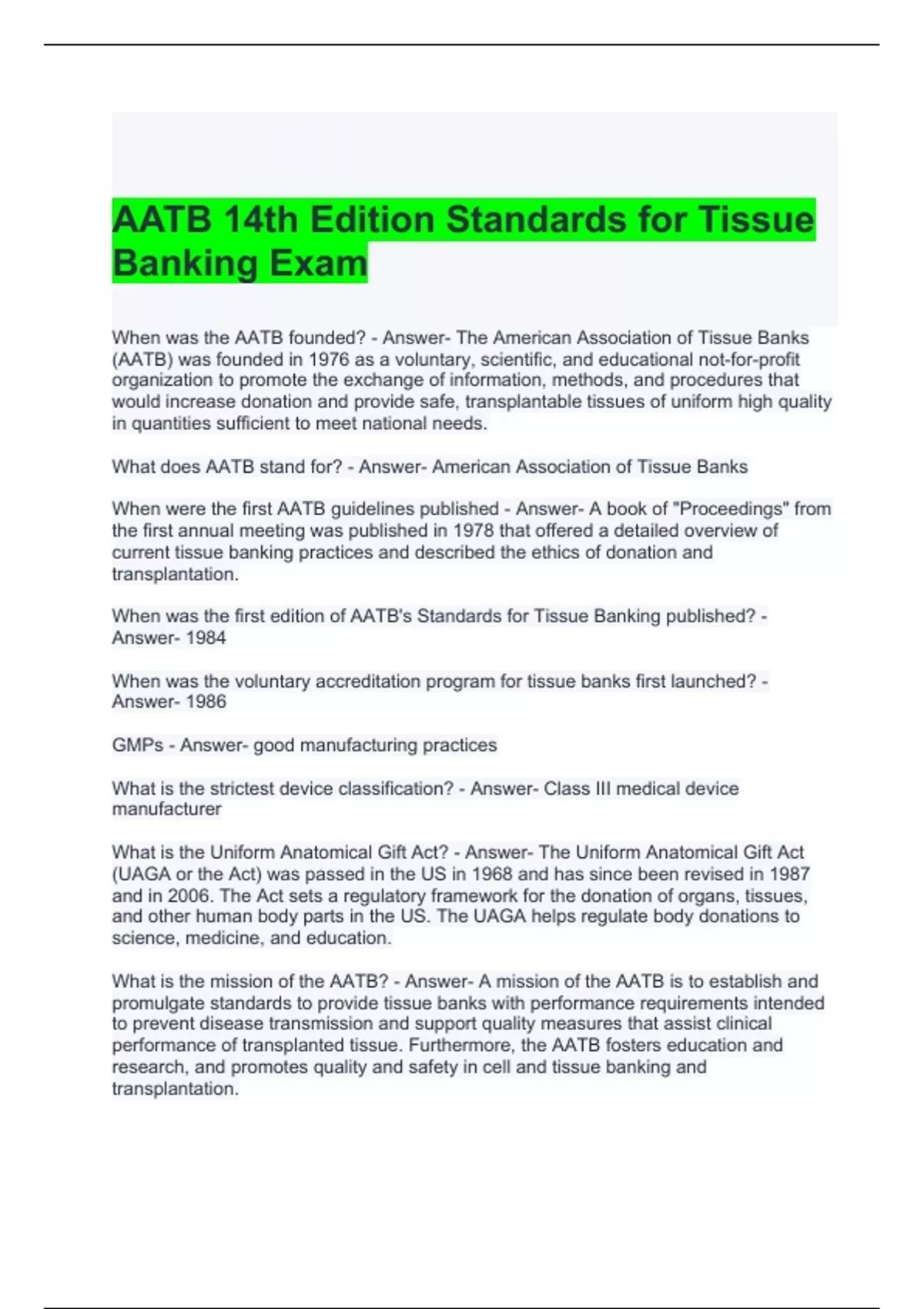 AATB 14th Edition Standards for Tissue Banking Exam 2024