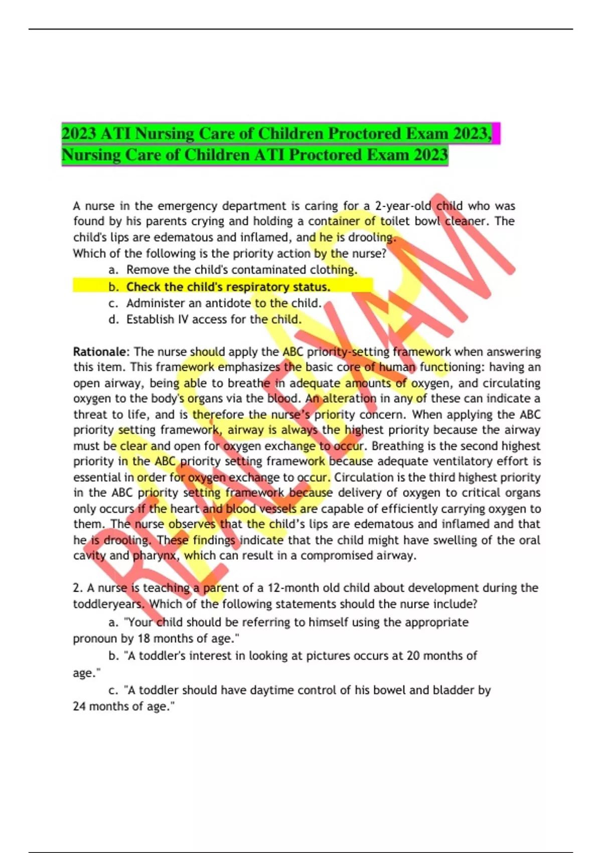 2023 ATI Nursing Care of Children Proctored Exam 2023, Nursing Care of Children ATI Proctored Exam 2023 A nurse in the emergency department is caring for a 2-year-old child who was found by his parents crying and holding a container of toilet bowl cleaner. The child's lips are edematous and inflamed, and he is drooling. Which of the following is the priority action by the nurse? a. Remove the child's contaminated clothing. b. Check the child's respiratory status. c. Administer an antidote to the child. d. Establish IV access for the child. Rationale: The nurse should apply the ABC priority-setting framework when answering this item. This framework emphasizes the basic core of human functioning: having an open airway, being able to breathe in adequate amounts of oxygen, and circulating oxygen to the body's organs via the blood. An alteration in any of these can indicate a threat to life, and is therefore the nurse’s priority concern. When applying the ABC priority setting framework, airway is always the highest priority because the airway must be clear and open for oxygen exchange to occur. Breathing is the second highest priority in the ABC priority setting framework because adequate ventilatory effort is essential in order for oxygen exchange to occur. Circulation is the third highest priority in the ABC priority setting framework because delivery of oxygen to critical organs only occurs if the heart and blood vessels are capable of efficiently carrying oxygen to them. The nurse observes that the child’s lips are edematous and inflamed and that he is drooling. These findings indicate that the child might have swelling of the oral cavity and pharynx, which can result in a compromised airway. 2. A nurse is teaching a parent of a 12-month old child about development during the toddleryears. Which of the following statements should the nurse include? a. "Your child should be referring to himself using the appropriate pronoun by 18 months of age." b. "A toddler's interest in looking at pictures occurs at 20 months of age." c. "A toddler should have daytime control of his bowel and bladder by 24 months of age." d. "Your child should be able to scribble spontaneously using a crayon at the age of 15 months." Rationale: The nurse should teach the parent that at the age of 15 months, the toddler should be able to scribble spontaneously, and at the age of 18 months, the toddler should be able to make strokes imitatively.