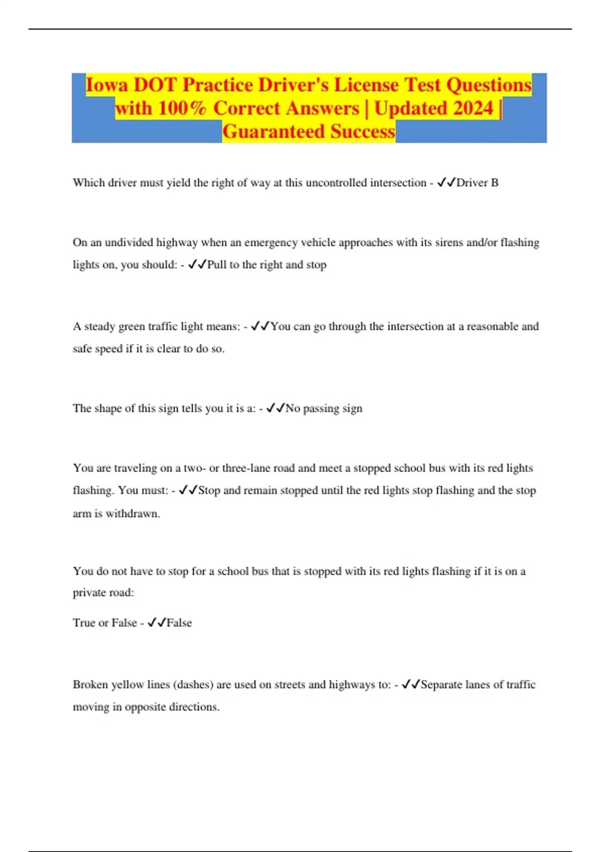 Iowa DOT Practice Driver's License Test Questions with 100% Correct Answers | Updated 2024 | Guaranteed Success
