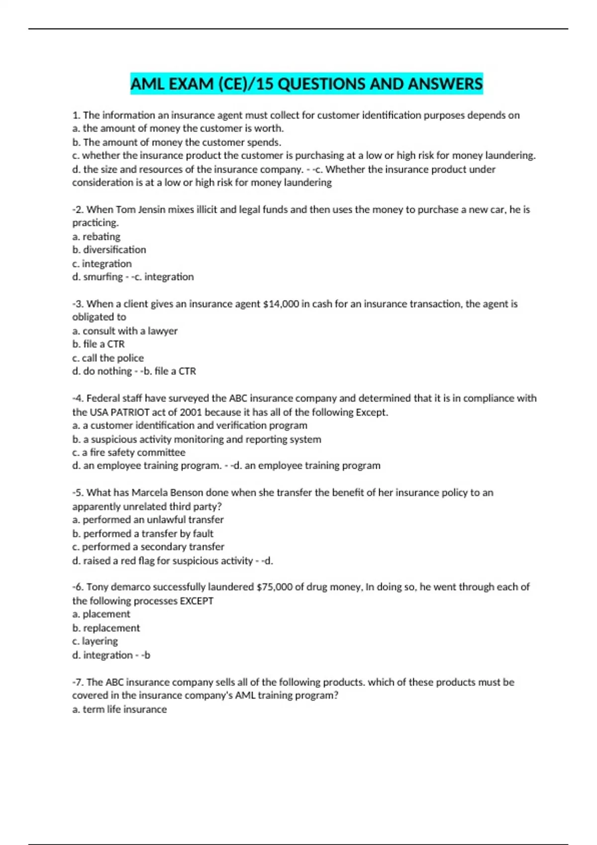 AML EXAM (CE)/15 QUESTIONS AND ANSWERS