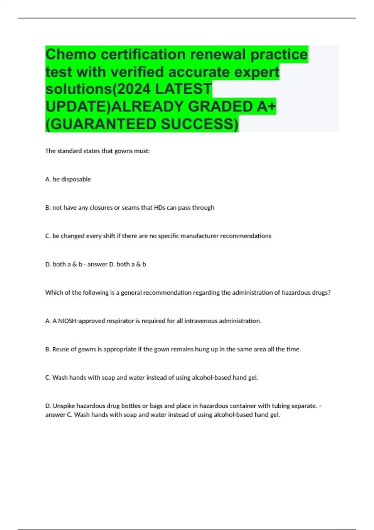 Chemo certification renewal practice test with verified accurate expert solutions(2024 LATEST UPDATE)ALREADY GRADED A+(GUARANTEED SUCCESS)