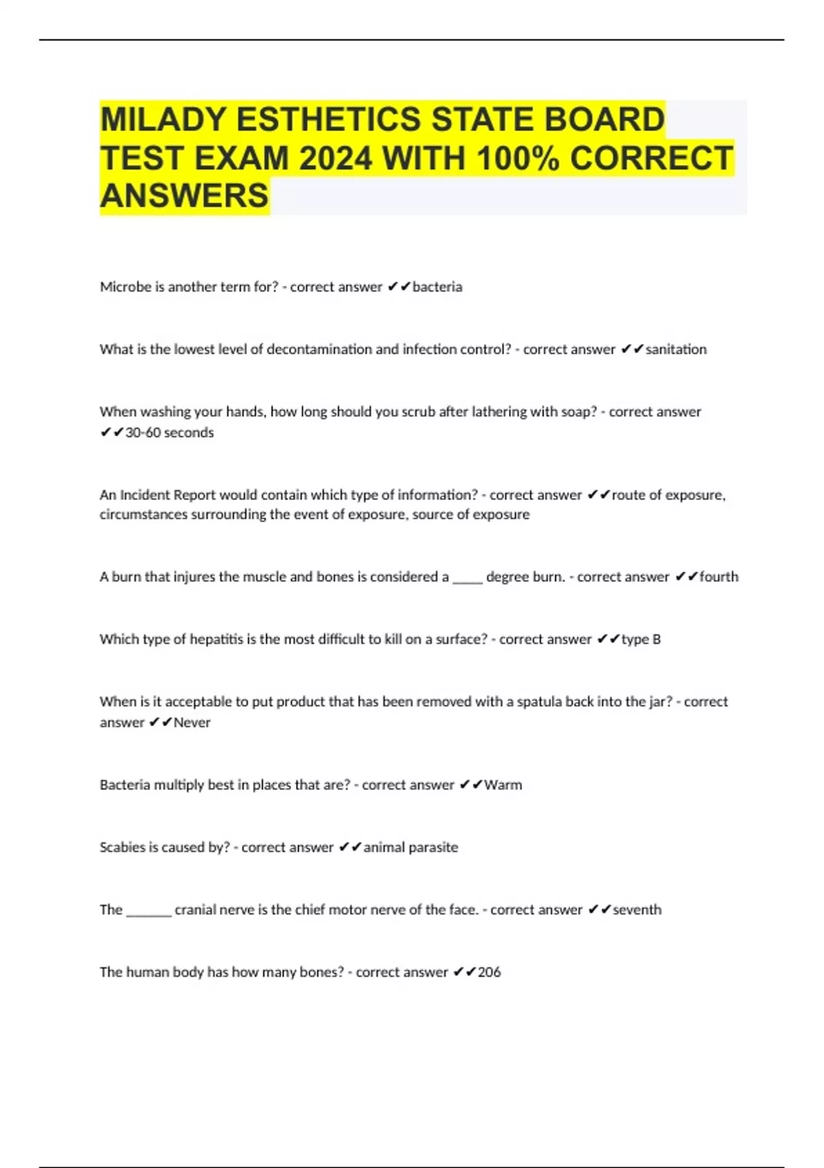 MILADY ESTHETICS STATE BOARD TEST EXAM 2024 WITH 100% CORRECT ANSWERS