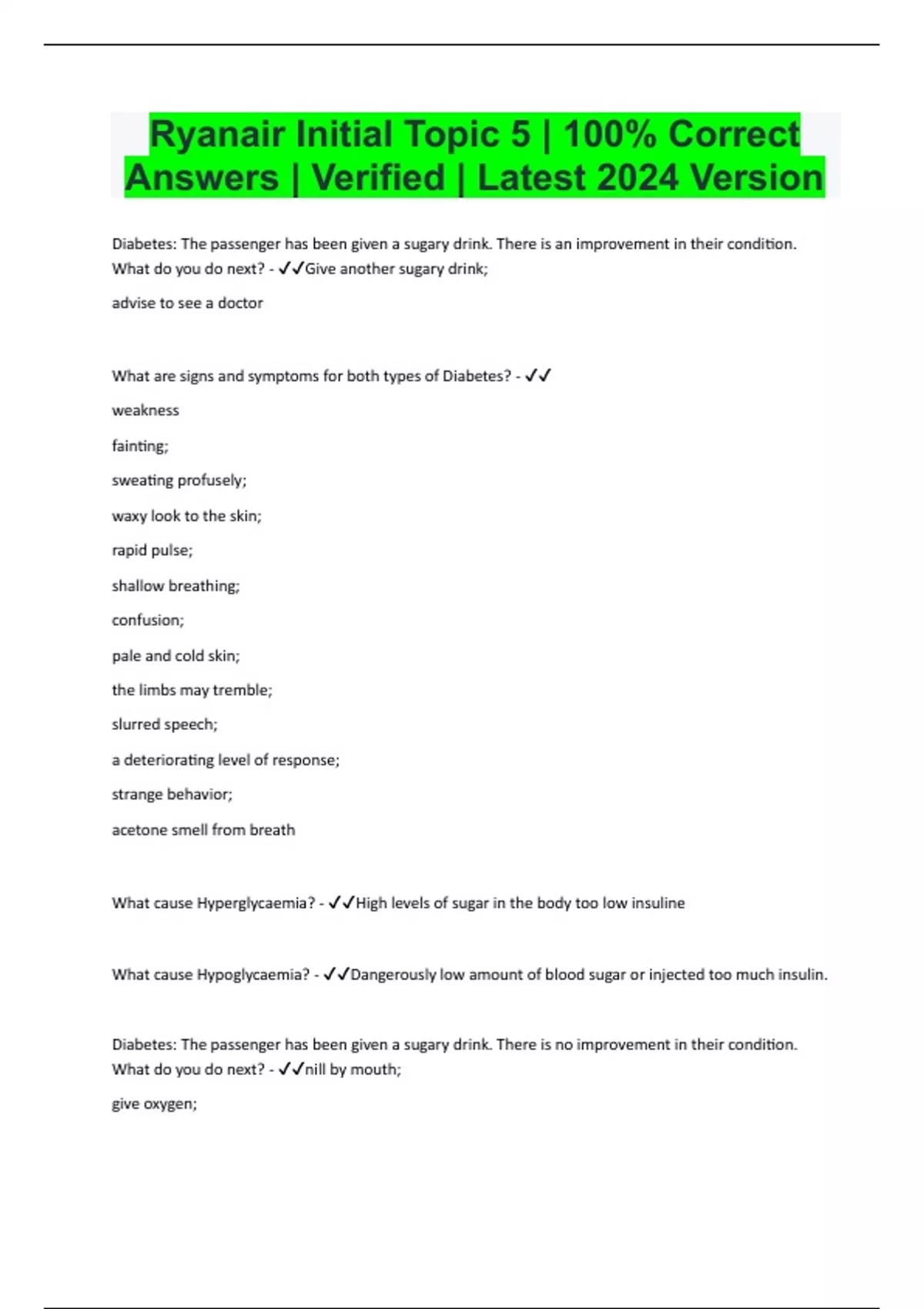 Diabetes: The passenger has been given a sugary drink. There is an improvement in their condition. What do you do next? - Give another sugary drink; advise to see a doctor What are signs and symptoms for both types of Diabetes? - weakness fainting; sweating profusely; waxy look to the skin; rapid pulse; shallow breathing; confusion; pale and cold skin; the limbs may tremble; slurred speech; a deteriorating level of response; strange behavior; acetone smell from breath What cause Hyperglycaemia?