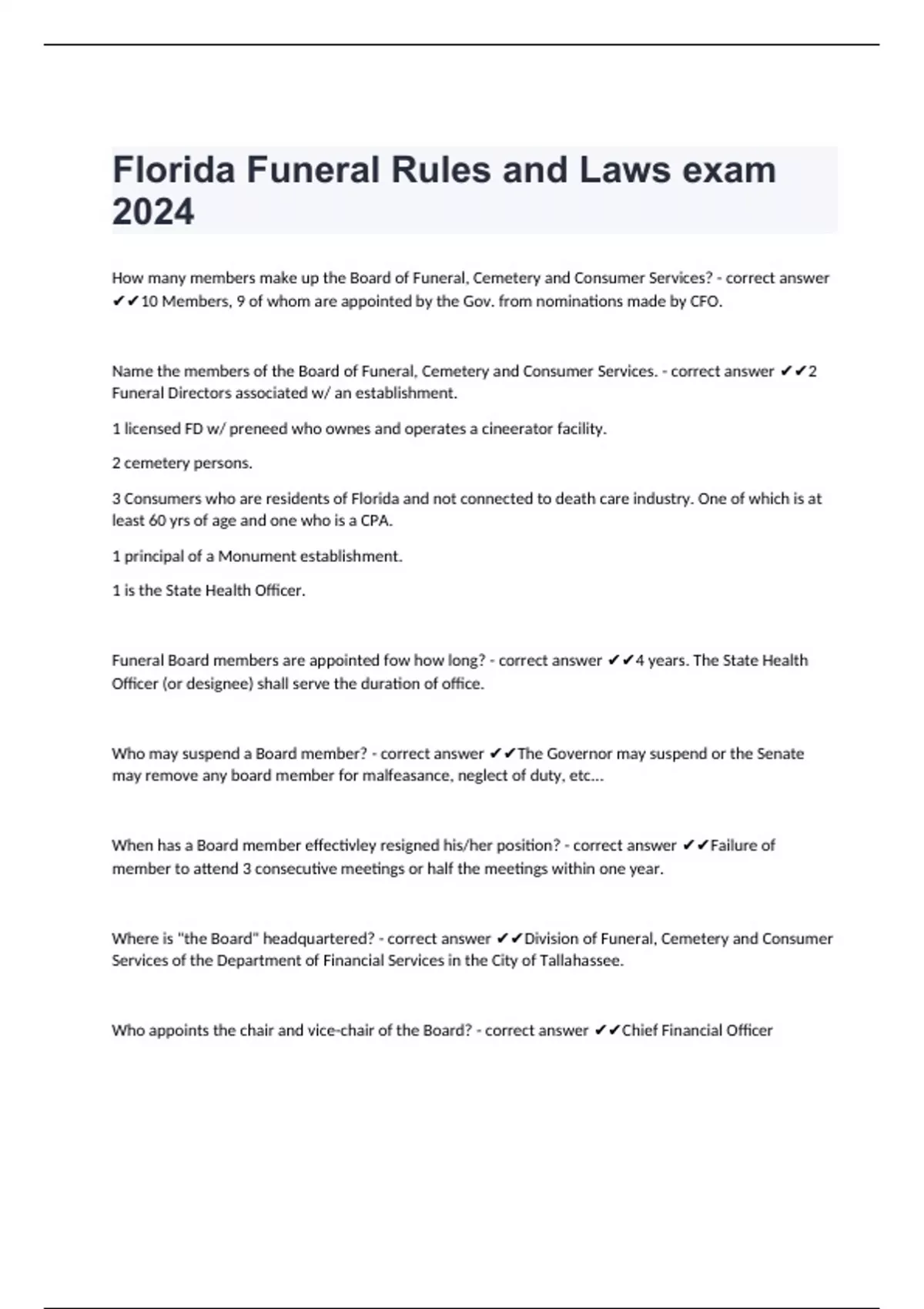How many members make up the Board of Funeral, Cemetery and Consumer Services? - correct answer 10 Members, 9 of whom are appointed by the Gov. from nominations made by CFO. Name the members of the Board of Funeral, Cemetery and Consumer Services. - correct answer 2 Funeral Directors associated w/ an establishment. 1 licensed FD w/ preneed who ownes and operates a cineerator facility. 2 cemetery persons. 3 Consumers who are residents of Florida and not connected to death care industry. One of which is at least 60 yrs of age and one who is a CPA. 1 principal of a Monument establishment. 1 is the State Health Officer. Funeral Board members are appointed fow how long? - correct answer 4 years. The State Health Officer (or designee) shall serve the duration of office. Who may suspend a Board member? - correct answer The Governor may suspend or the Senate may remove any board member for malfeasance, neglect of duty, etc... When has a Board member effectivley resigned his/her position? - correct answer Failure of member t