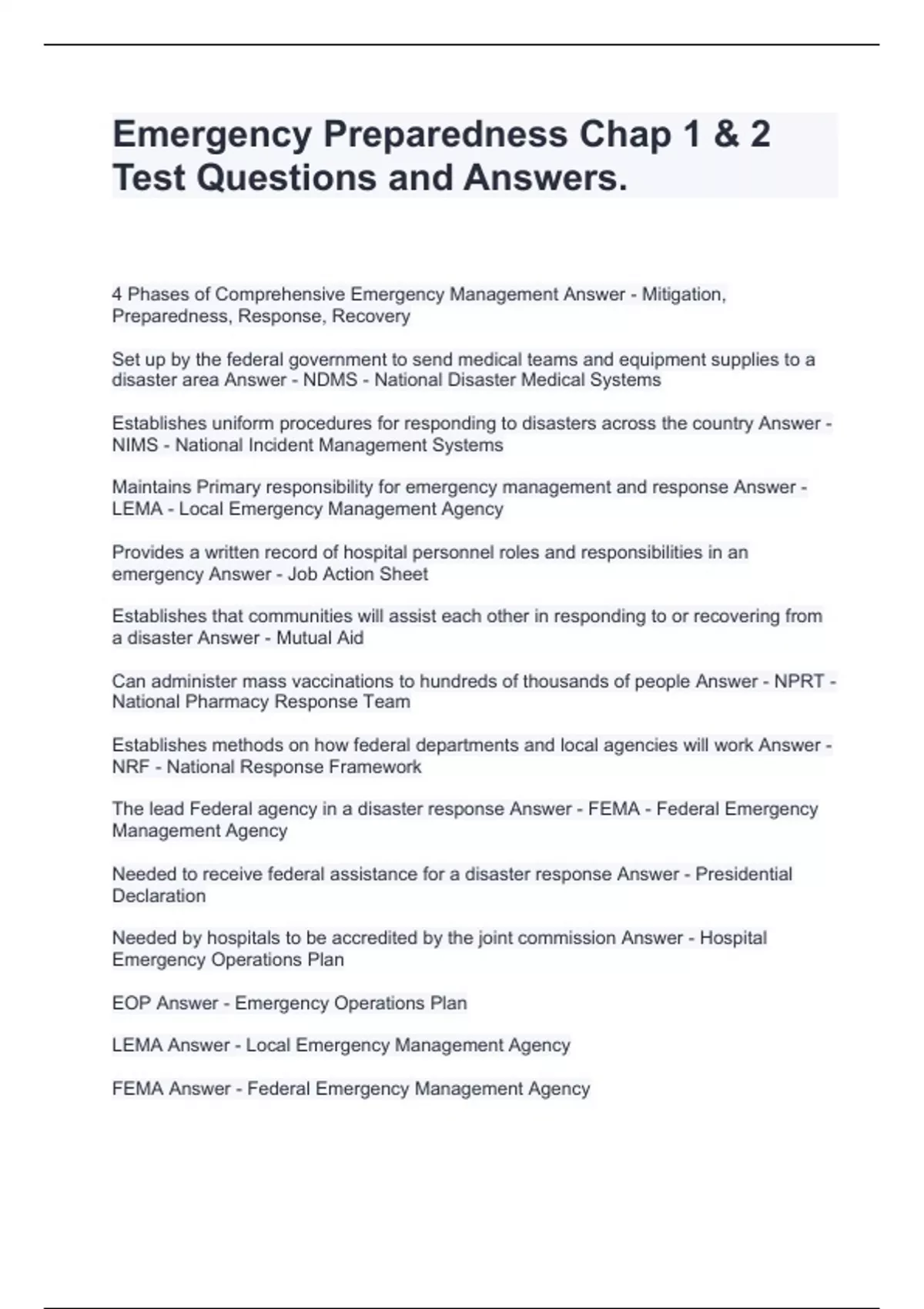 Emergency Preparedness Chap 1 & 2 Test Questions and Answers.