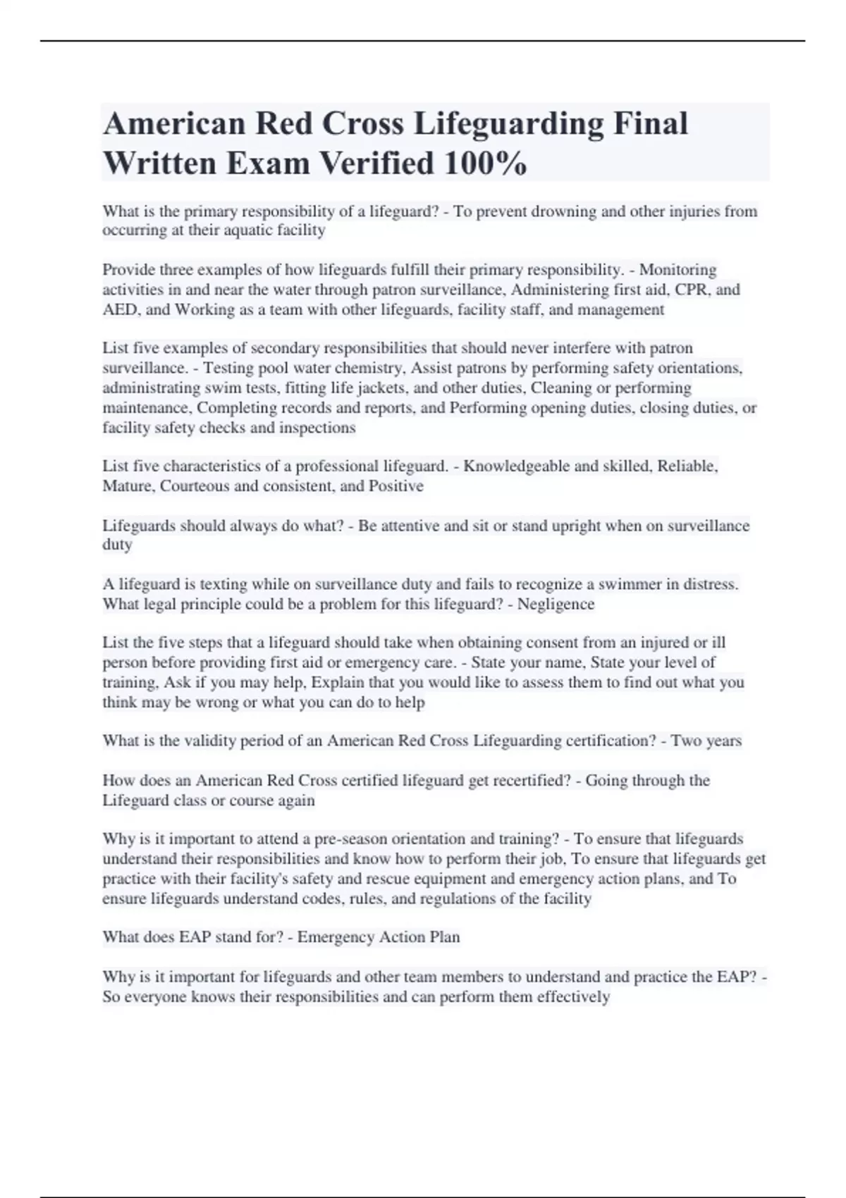 American Red Cross Lifeguarding Final Written Exam Verified 100% What is the primary responsibility of a lifeguard? - To prevent drowning and other injuries from occurring at their aquatic facility Provide three examples of how lifeguards fulfill their primary responsibility. - Monitoring activities in and near the water through patron surveillance, Administering first aid, CPR, and AED, and Working as a team with other lifeguards, facility staff, and management List five examples of secondary responsibilities that should never interfere with patron surveillance. - Testing pool water chemistry, Assist patrons by performing safety orientations, administrating swim tests, fitting life jackets, and other duties, Cleaning or performing maintenance, Completing records and reports, and Performing opening duties, closing duties, or facility safety checks and inspections List five characteristics of a professional lifeguard. - Knowledgeable and skilled, Reliable, Mature, Courteous and consistent, and Positive Lifeguards should always do what? - Be attentive and sit or stand upright when on surveillance duty A lifeguard is texting while on surveillance duty and fails to recognize a swimmer in distress. What legal principle could be a problem for this lifeguard? - Negligence List the five steps that a lifeguard should take when obtaining consent from an injured or ill person before providing first aid or emergency care. - State your name, State your level of training, Ask if you may help, Explain that you would like to assess them to find out what you think may be wrong or what you can do to help What is the validity period of an American Red Cross Lifeguarding certification? - Two years How does an American Red Cross certified lifeguard get recertified? - Going through the Lifeguard class or course again Why is it important to attend a pre-season orientation and training? - To ensure that lifeguards understand their responsibilities and know how to perform their job, To ensure that lifeguards get practice with their facility's safety and rescue equipment and emergency action plans, and To ensure lifeguards understand codes, rules, and regulations of the facility What does EAP stand for? - Emergency Action Plan Why is it important for lifeguards and other team members to understand and practice the EAP? - So everyone knows their responsibilities and can perform them effectively What is the best practice for the frequency of in-service training participation at well-managed aquatic facilities? - At least four hours of in-service training each month What are four topics that could be a discussed during in-service training? - Surveillance and recognition, Water and land rescue skills, Emergency response drills, and Decision-making protocols (or Facility rules and regulations, Customer service, Records and reports, and Physical conditioning) What are the benefits of regular, frequent in-service training? - Helps you maintain your knowledge and skills at a professional level, gives you a chance to practice with other lifeguards at your facility, and it will help you to efficiently respond as a team in an emergency In a water park setting, what additional items might be included in a safety checklist? - Inspecting and test run of rides and slides, Checking that rafts, tubes, and/or sleds are properly inflated and the handles are secure, Landing areas are free of rough surfaces and debris, Water level and flow is appropriate for attraction, and Electronic dispatch systems are tested and are operating properly Why should water parks have signs posted at every attraction stating the water depth? - To prevent patrons from finding themselves in water that is deeper or shallower than they expected What rules are typically covered at water park attractions? - The minimum or maximum number of people allowed on an attraction or tube at a time, The maximum and minimum height or weight requirements for patrons using an attraction, Rules for winding rivers, No jumping or diving into the water, No climbing on any features, Rules for water slides, and No stacking of tubes or life jackets What are some factors that make lifeguarding water parks different than typical pool? - Various attractions, Ride Vehicles, Currents on attractions, Potentially larger crowds, and Different rules and EAPs What items are considered to be personal protective equipment for a lifeguard? - Gowns, Shields, Resuscitation masks, Gloves, and Protective Eyewear What equipment should be worn or carried by a lifeguard at all times while on duty? (List at least two and include the reason(s) why this equipment should be worn or carried.) - Rescue tubes are capable of keeping multiple victims afloat and whistles are used to activate their facility's EAP and get attention of other members of the safety team and patrons for policy enforcement What safety equipment/items should be easily accessible for a lifeguard while on duty?(List at least two and describe how/when each item is used.) - Backboards are used to remove victims from the water when they are unable to exit the water on their own or when they have a possible injury to the head, neck, or spine and first aid kits include supplies used to treat common injuries at aquatic facilities As a lifeguard you are responsible for consistently enforcing what? - Your facility's rules and regulations List the five common rules and regulations often posted at an aquatic facility. - Swim only when a lifeguard is on duty, No running, pushing, or rough play, Dive in designated areas, No swimming with open or infected wounds, and No alcoholic beverages or drug use allowed Explain what it means to be "equipped and rescue-ready." - You are wearing or carrying the appropriate rescue equipment for your facility and ready to enter the water to perform a rescue What is a good list of typical safety checklist items, along with others, applies to a lakefront swimming area? - Bottom conditions, pier attachments, buoys