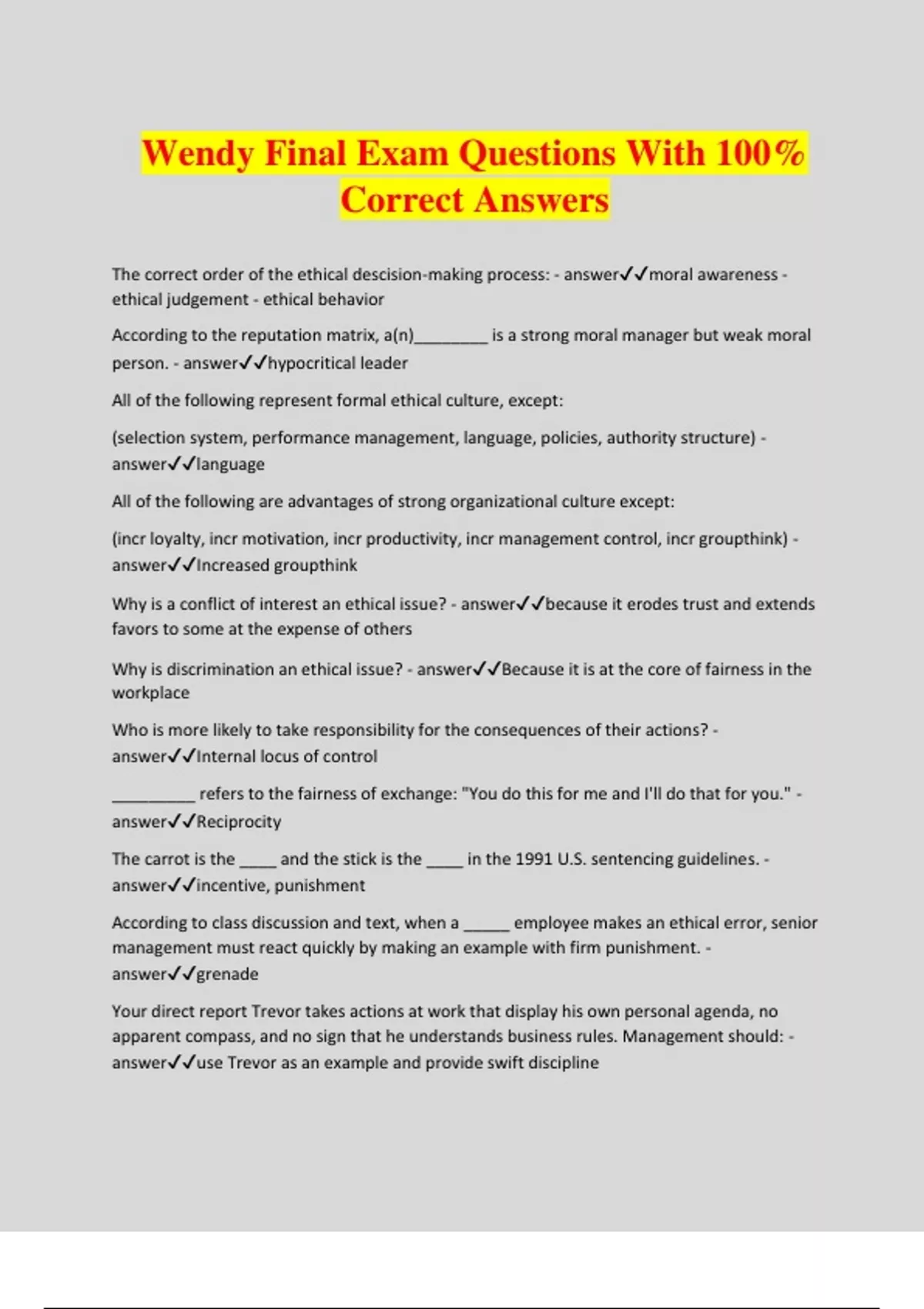 Wendy Final Exam Questions With 100% Correct Answers The correct order of the ethical descision-making process: - answermoral awareness - ethical judgement - ethical behavior According to the reputation matrix, a(n)________ is a strong moral manager but weak moral person. - answerhypocritical leader All of the following represent formal ethical culture, except: (selection system, performance management, language, policies, authority structure) - answerlanguage All of the following are advantages of strong organizational culture except: (incr loyalty, incr motivation, incr productivity, incr management control, incr groupthink) - answerIncreased groupthink Why is a conflict of interest an ethical issue? - answerbecause it erodes trust and extends favors to some at the expense of others Why is discrimination an ethical issue? - answerBecause it is at the core of fairness in the workplace Who is more likely to take responsibility for the consequences of their actions? - answerInternal locus of control _________ refers to the fairness of exchange: "You do this for me and I'll do that for you." - answerReciprocity The carrot is the ____ and the stick is the ____ in the 1991 U.S. sentencing guidelines. - answerincentive, punishment According to class discussion and text, when a _____ employee makes an ethical error, senior management must react quickly by making an example with firm punishment. - answergrenade Your direct report Trevor takes actions at work that display his own personal agenda, no apparent compass, and no sign that he understands business rules. Management should: - answeruse Trevor as an example and provide swift discipline