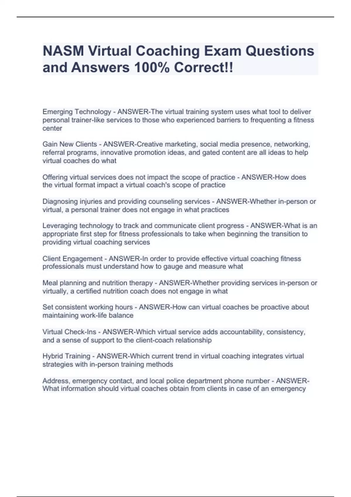 NASM Virtual Coaching Exam Questions and Answers 100% Correct!!