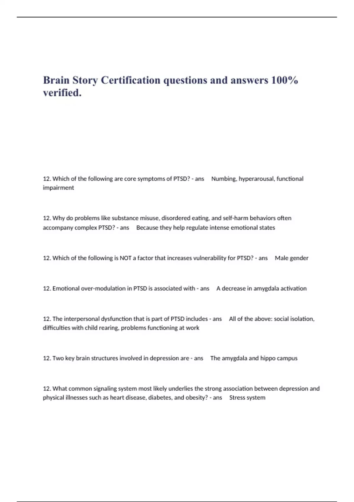12. Which of the following are core symptoms of PTSD? - ans Numbing, hyperarousal, functional impairment 12. Why do problems like substance misuse, disordered eating, and self-harm behaviors often accompany complex PTSD? - ans Because they help regulate intense emotional states 12. Which of the following is NOT a factor that increases vulnerability for PTSD? - ans Male gender 12. Emotional over-modulation in PTSD is associated with - ans A decrease in amygdala activation 12. The interpersonal dysfunction that is part of PTSD includes - ans All of the above: social isolation, difficulties with child rearing, problems functioning at work 12. Two key brain structures involved in depression are - ans The amygdala and hippo campus 12. What common signaling system most likely underlies the strong association between depression and physical illnesses such as heart disease, diabetes, and obesity? - ans Stress system