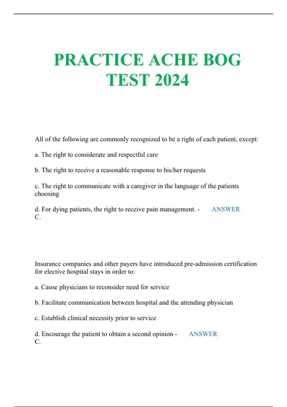 PRACTICE ACHE BOG TEST 2024 All of the following are commonly recognized to be a right of each patient, except: a. The right to considerate and respectful care b. The right to receive a reasonable response to his/her requests c. The right to communicate with a caregiver in the language of the patients choosing d. For dying patients, the right to receive pain management. - ANSWER C. Insurance companies and other payers have introduced pre-admission certification for elective hospital stays in order to: a. Cause physicians to reconsider need for service b. Facilitate communication between hospital and the attending physician c. Establish clinical necessity prior to service d. Encourage the patient to obtain a second opinion - ANSWER C. Guidelines produced by the Agency for Health Care Policy and Research: a. Have been shown to decrease healthcare costs b. Rarely need to be revised c. Provide starting points for managing individual patients d. Have been shown to improve the quality of care - ANSWER C. CEO compensation should be based on: a. The compensation arrangements with the prior CEO b. Executive compensation in local corporations with similar gross revenues c. Present salary plus cost-of-living adjustment d. What the institution would have to pay for a similarly prepared person if that person were employed elsewhere - ANSWER D. An essential function of the governing board is to: a. Approve the mission, vision, and long-range plan b. Focus on strategic planning c. Prepare the operating plan d. Review performance of departmental activities - ANSWER A. Members of the medical staff are eligible for full membership on the governing board in the same manner as other individuals: a. When not legally prohibited b. When they do not actively practice in the organization c. When they are not full-time employees d. If they are not foreign nationals - ANSWER A. Regarding the budget, the board: a. Does not use the budget exercise as a way to improve quality and productivity b. Gets involved in preparing budgets for all operational units c. Decides which personnel are needed in top management d. Establishes guidelines and makes final choices among competing opportunities - ANSWER D.