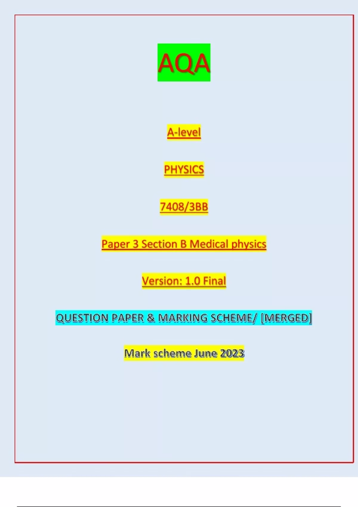 AQA A LEVEL PHYSICS 7408/3BB PAPER 3 SECTION B MEDICAL PHYSICS VERSION 1.0 FINAL QUESTION PAPERS & MERGED MARKING SCHEME | JUNE 2023