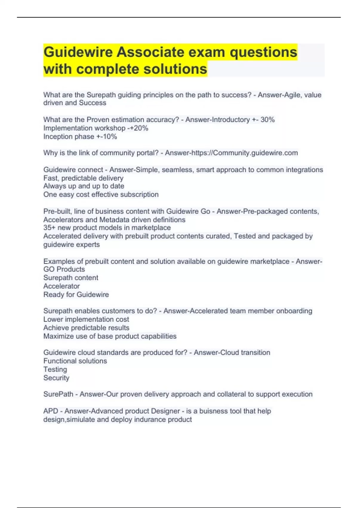 Guidewire Associate exam questions with complete solutions Guidewire connect - Answer-Simple, seamless, smart approach to common integrations Fast, predictable delivery Always up and up to date One easy cost effective subscription Pre-built, line of business content with Guidewire Go - Answer-Pre-packaged contents, Accelerators and Metadata driven definitions 35+ new product models in marketplace Accelerated delivery with prebuilt product contents curated, Tested and packaged by guidewire experts