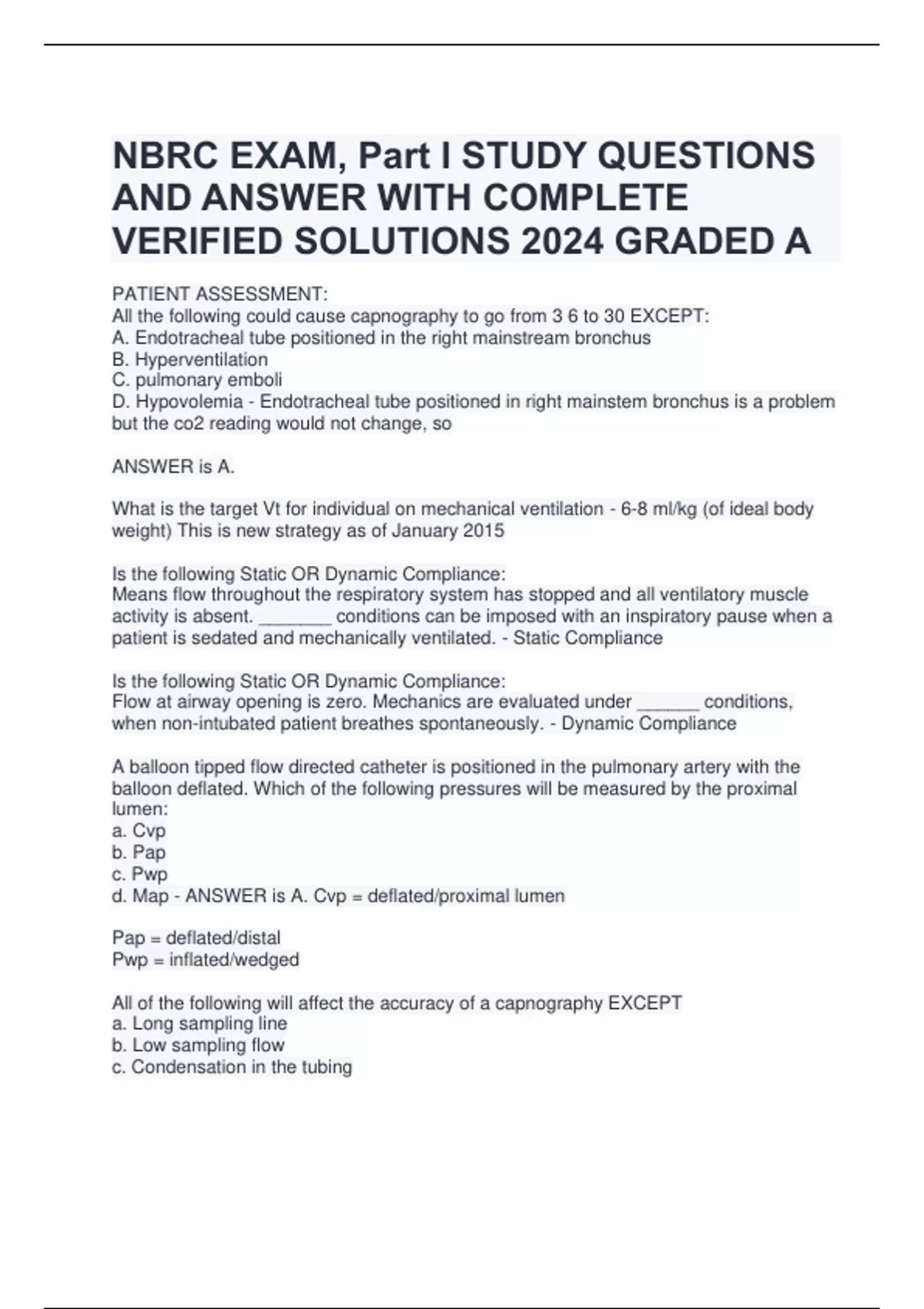 NBRC EXAM, Part I STUDY QUESTIONS AND ANSWER WITH COMPLETE VERIFIED SOLUTIONS 2024 GRADED A