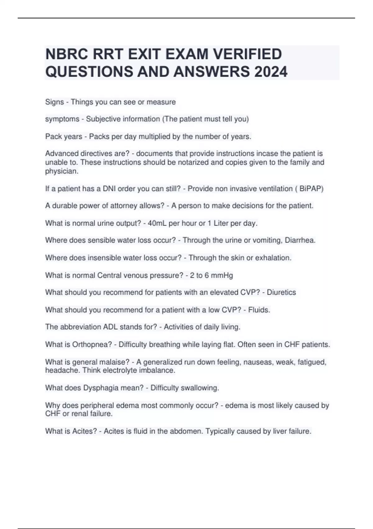 Signs - Things you can see or measure symptoms - Subjective information (The patient must tell you) Pack years - Packs per day multiplied by the number of years. Advanced directives are? - documents that provide instructions incase the patient is unable to. These instructions should be notarized and copies given to the family and physician. If a patient has a DNI order you can still? - Provide non invasive ventilation ( BiPAP) A durable power of attorney allows? - A person to make decisions for the patient. What is normal urine output? - 40mL per hour or 1 Liter per day. Where does sensible water loss occur? - Through the urine or vomiting, Diarrhea. Where does insensible water loss occur? - Through the skin or exhalation. What is normal Central venous pressure? - 2 to 6 mmHg What should you recommend for patients with an elevated CVP? - Diuretics What should you recommend for a patient with a low CVP? - Fluids. The abbreviation ADL stands for? - Activities of daily living. What is Orthopnea? - Difficulty breathing while laying flat. Often seen in CHF patients. What is general malaise? - A generalized run down feeling, nauseas, weak, fatigued, headache. Think electrolyte imbalance. What does Dysphagia mean? - Difficulty swallowing. Why does peripheral edema most commonly occur? - edema is most likely caused by CHF or renal failure. What is Acites? - Acites is fluid in the abdomen. Typically caused by liver failure. What causes clubbing of the fingers? - Chronic hypoxemia. How fast should color return to a finger during a capillary refill test? - Blood should return in less than 3 seconds. What is Diaphoresis? - A state of profuse sweating. What is Jaundice? - A yellowish appearance of the skin caused by increased bilirubin in the blood and tissue. What is Erythema? - Redness of the skin due from capillary congestion, inflammation, or infection. Cyanosis is caused by? - Reduced oxyhemoglobin. How much oxyhemoglobin loss is required to cause cyanosis? - 5 Grams. Barrel chest is caused by? - Air trapping in the lungs for long periods of time. Cheyne stokes respirations - gradually increasing then decreasing rate and depth with periods of apnea. Biot's respirations - Increased rate and depth with irregular periods of apnea. Each breath has the same depth. Kussmauls respirations - Fast and Deep The normal muscles of ventilation are? - The Diaphragm and external intercostals. Retractions and nasal flaring mean? - An obstructed airway. What is macroglossia? - an enlarged tongue. What is the most common cause of tachycardia? - Hypoxemia. How much change in heart rate signifies an adverse reaction. - A change of 20bpm indicates an adverse reaction. What is pulsus paradoxus? - A pulse or blood pressure that varies during respiration. What is tactile fremitus? - Vibrations that can be felt on the chest wall. Such as rhonchi, pleural rubbing, vocal. What is crepitus? - Bubbles of air under the skin that can be palpated (Subcutaneous emphysema)