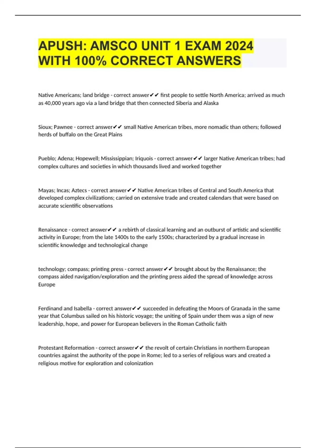 apush amsco unit 1 exam 2024 with 100 correct an