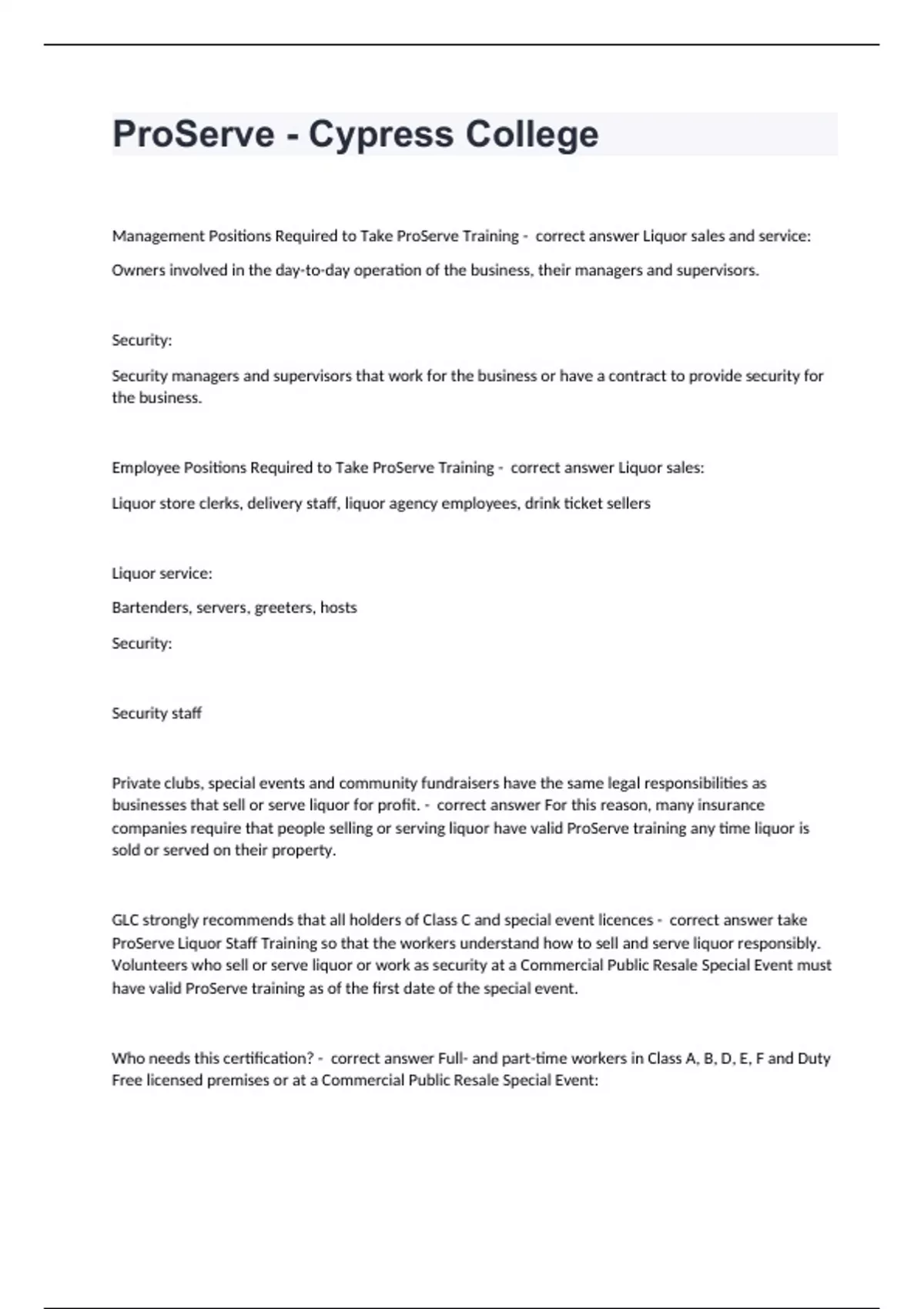 ProServe - Cypress CollegeManagement Positions Required to Take ProServe Training - correct answer Liquor sales and service: Owners involved in the day-to-day operation of the business, their managers and supervisors. Security: Security managers and supervisors that work for the business or have a contract to provide security for the business. Employee Positions Required to Take ProServe Training - correct answer Liquor sales: Liquor store clerks, delivery staff, liquor agency employees, drink ticket sellers Liquor service: Bartenders, servers, greeters, hosts Security: Security staff Private clubs, special events and community fundraisers have the same legal responsibilities as businesses that sell or serve liquor for profit. - correct answer For this reason, many insurance companies require that people selling or serving liquor have valid ProServe training any time liquor is sold or served on their property. GLC strongly recommends that all holders of Class C and special event licences - correct answer take ProServe Liquor Staff Training so that the workers understand how to sell and serve liquor responsibly. Volunteers who sell or serve liquor or work as security at a Commercial Public Resale Special Event must have valid ProServe training as of the first date of the special event. Who needs this certification? - correct answer Full- and part-time workers in Class A, B, D, E, F and Duty Free licensed premises or at a Commercial Public Resale Special Event:
