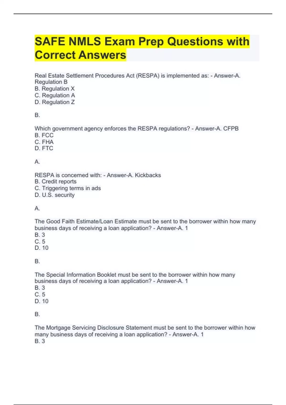 SAFE NMLS Exam Prep Questions with Correct Answers RESPA is concerned with: - Answer-A. Kickbacks B. Credit reports C. Triggering terms in ads D. U.S. security A. The Good Faith Estimate/Loan Estimate must be sent to the borrower within how many business days of receiving a loan application? - Answer-A. 1 B. 3 C. 5 D. 10 B. The Special Information Booklet must be sent to the borrower within how many business days of receiving a loan application? - Answer-A. 1 B. 3 C. 5 D. 10 B. The Mortgage Servicing Disclosure Statement must be sent to the borrower within how many business days of receiving a loan application? - Answer-A. 1 B. 3