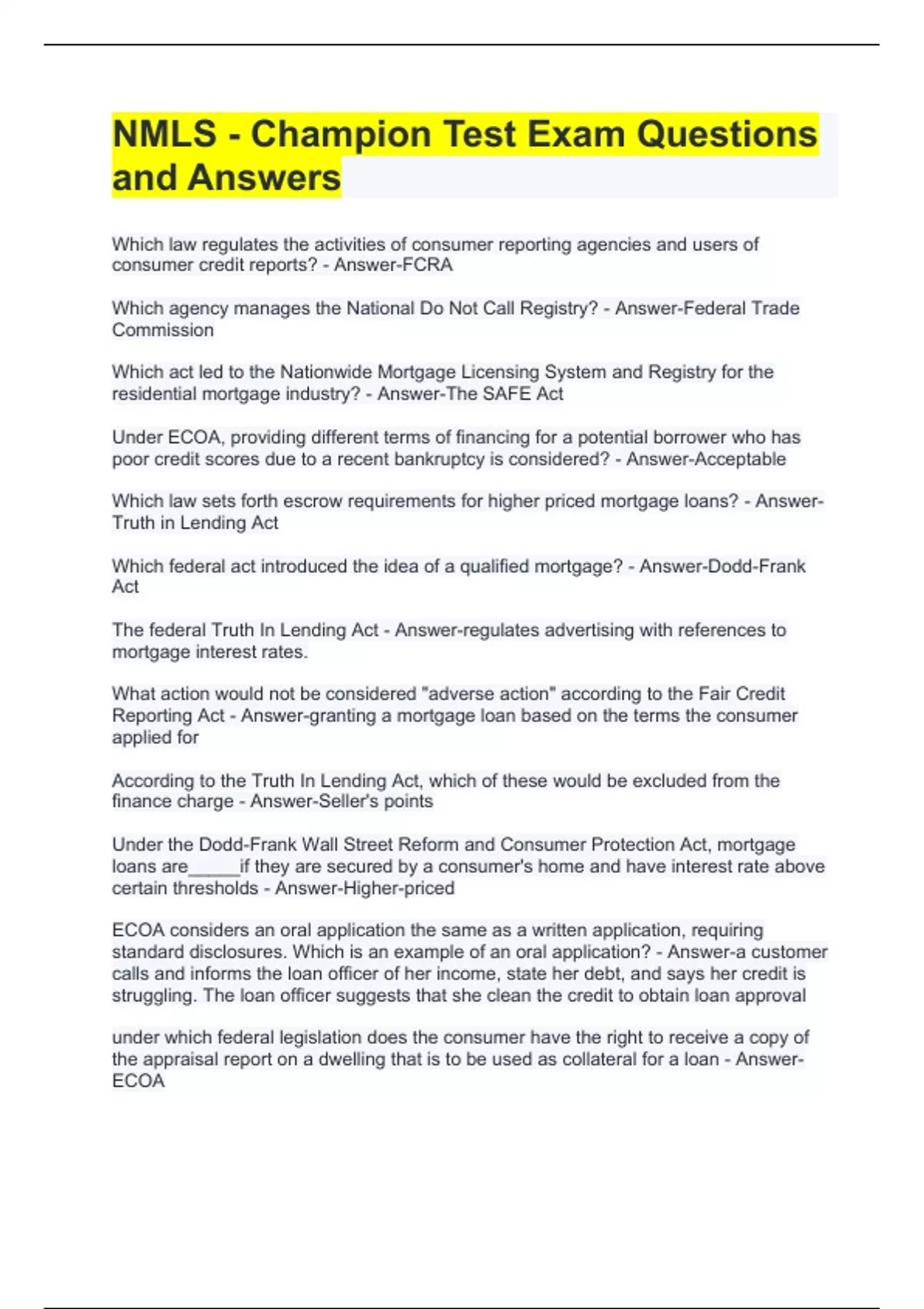 NMLS - Champion Test Exam Questions and Answers Which law sets forth escrow requirements for higher priced mortgage loans? - Answer-Truth in Lending Act Which federal act introduced the idea of a qualified mortgage? - Answer-Dodd-Frank Act The federal Truth In Lending Act - Answer-regulates advertising with references to mortgage interest rates. What action would not be considered "adverse action" according to the Fair Credit Reporting Act - Answer-granting a mortgage loan based on the terms the consumer applied for
