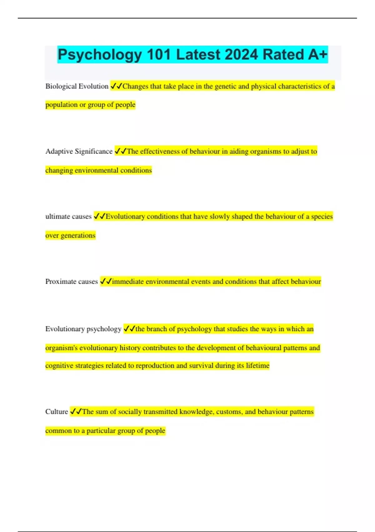 Psychology 101 Latest 2024 Rated A+ Biological Evolution Changes that take place in the genetic and physical characteristics of a population or group of people Adaptive Significance The effectiveness of behaviour in aiding organisms to adjust to changing environmental conditions ultimate causes Evolutionary conditions that have slowly shaped the behaviour of a species over generations Proximate causes immediate environmental events and conditions that affect behaviour Evolutionary psychology the branch of psychology that studies the ways in which an organism's evolutionary history contributes to the development of behavioural patterns and cognitive strategies related to reproduction and survival during its lifetime Culture The sum of socially transmitted knowledge, customs, and behaviour patterns common to a particular group of people Artificial Selection A procedure in which animals are deliberately mated to produce offspring that possess particularly desirable characteristics Natural Selection The consequence of the fact that, because there are physical and behavioural differences among organisms, they reproduce differentially. Within a given population, some animals- the survivors - will produce more offspring than will other animals Reproductive success The number of viable offspring an individual produces relative to the number of viable offspring produced by other members of the same species Variation The differences found across individuals of any given species in terms of their genetic, biological (size, strength, physiology), and psychological (intelligence, sociability, behaviour) characteristics genotype An organism's genetic makeup phenotype The outward expression of an organism's genotype; an organism's physical appearance and behaviour competition A striving or vying with others who share the same ecological niche for food, mate, and territory Bipedalism The ability to move about the environment upright on two feet Encephalization Increases in brain size Cultural Evolution The adaptive changes of cultures in response to environmental changes over time Genetics The study of the genetic makeup