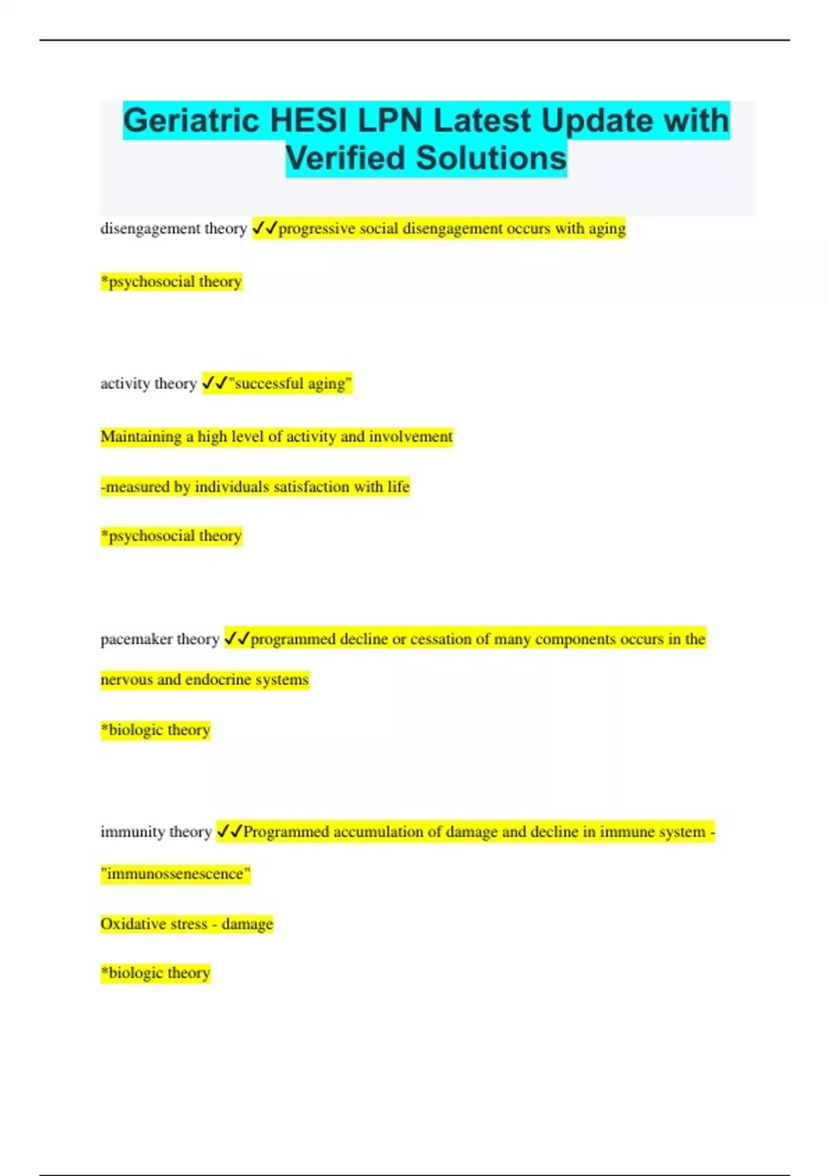 Geriatric HESI LPN Latest Update with Verified Solutions disengagement theory progressive social disengagement occurs with aging *psychosocial theory activity theory "successful aging" Maintaining a high level of activity and involvement -measured by individuals satisfaction with life *psychosocial theory pacemaker theory programmed decline or cessation of many components occurs in the nervous and endocrine systems *biologic theory immunity theory Programmed accumulation of damage and decline in immune system - "immunossenescence" Oxidative stress - damage *biologic theory wear and tear theory after repeated use damaged cells in body structures wear out from harmful effects of internal and external stressors, free radicals *biologic theory programmed theory "biological clock" starts at conception -genetic program determines changes as one ages *biologic theory erik eriksons theory 8 stages of developmental tasks thru out life span -8th stage is integrity versus despair *developmental theory maslows theory hierarchy of needs ranks an individuals needs from most basic to complex -physiologic -safety & security -love & belonging -self esteem -self actualization physiologic changes of aging 1. aging affects every cell in every organ, but not same rate 2. -loss in compensatory reserve -loss in efficiency of body repairing damaged tissue -deceased immune system processes