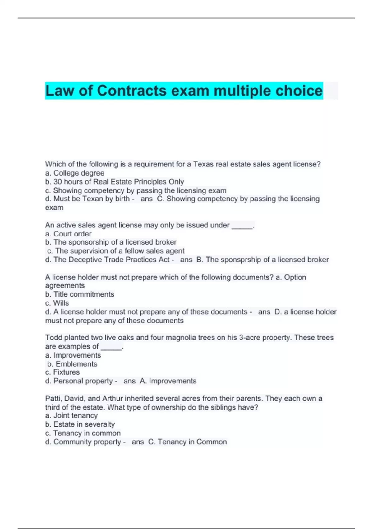 Law of Contracts exam multiple choice