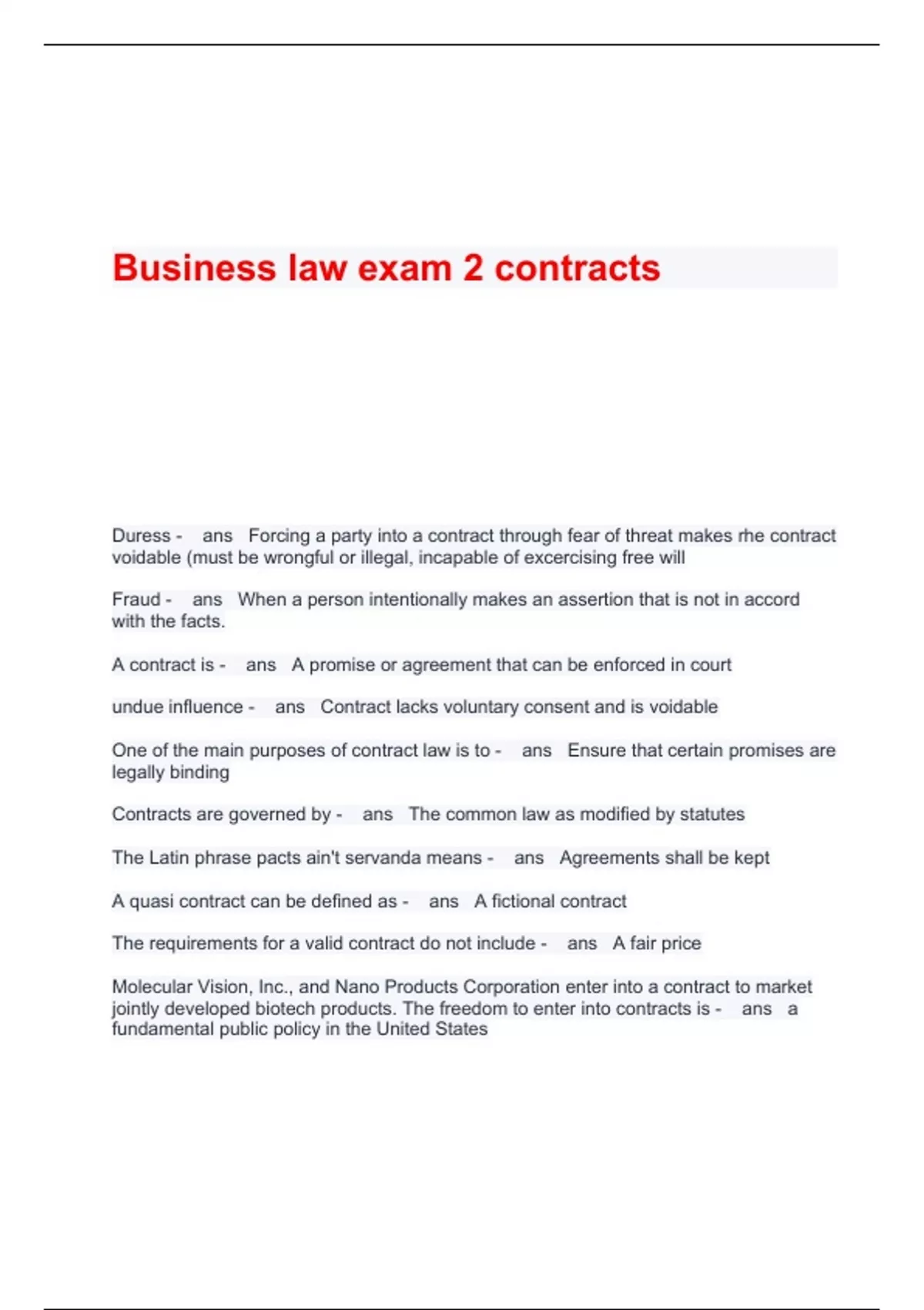law of contracts exam 2 questions with correct ans