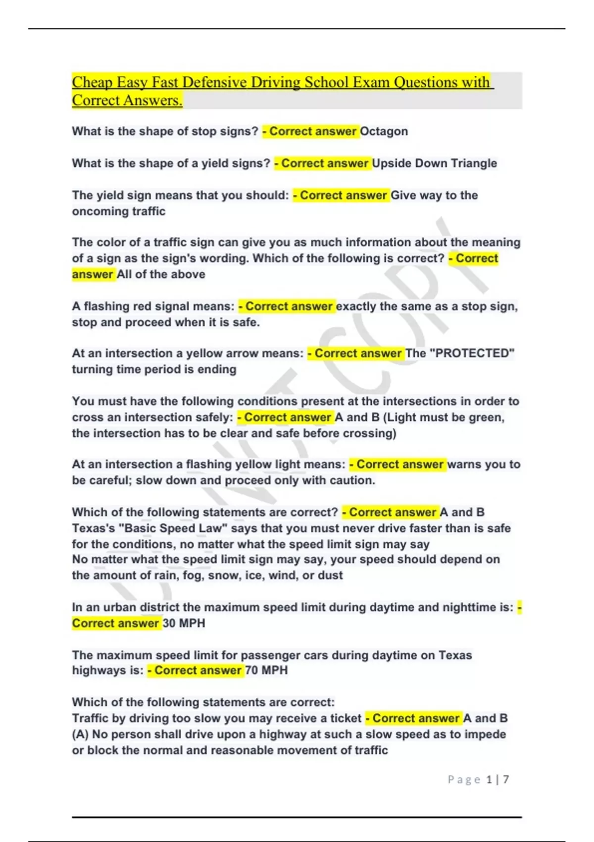 Cheap Easy Fast Defensive Driving School Exam Questions with Correct Answers.Cheap Easy Fast Defensive Driving School Exam Questions with Correct Answers.