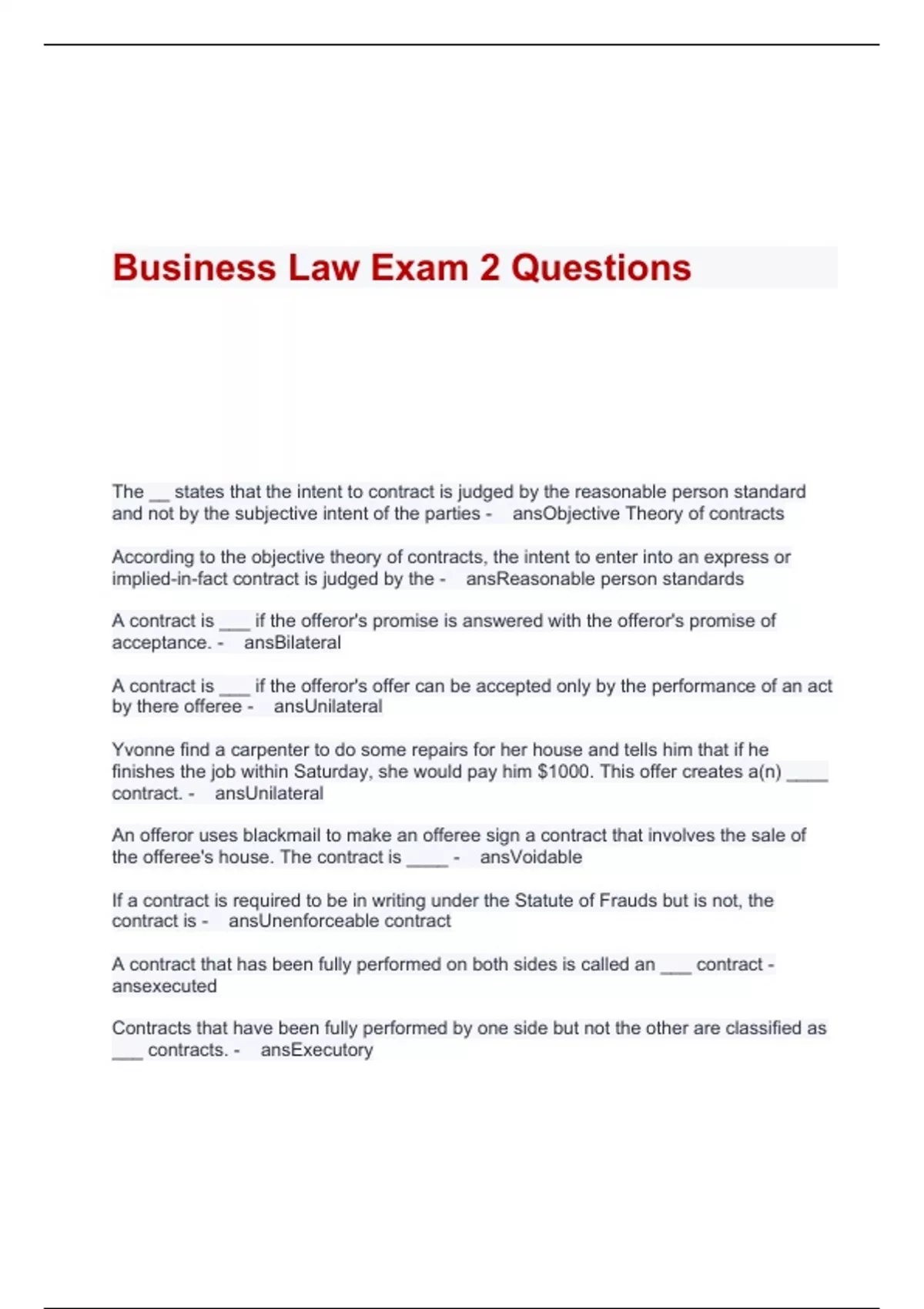 The __ states that the intent to contract is judged by the reasonable person standard and not by the subjective intent of the parties - ansObjective Theory of contracts According to the objective theory of contracts, the intent to enter into an express or implied-in-fact contract is judged by the - ansReasonable person standards A contract is ___ if the offeror's promise is answered with the offeror's promise of acceptance. - ansBilateral A contract is ___ if the offeror's offer can be accepted only by the performance of an act by there offeree - ansUnilateral Yvonne find a carpenter to do some repairs for her house and tells him that if he finishes the job within Saturday, she would pay him $1000. This offer creates a(n) ____ contract. - ansUnilateral An offeror uses blackmail to make an offeree sign a contract that involves the sale of the offeree's house. The contract is ____ - ansVoidable If a contract is required to be in writing under the Statute of Frauds but is not, the contract is - ansUnenforceable contract A contract that has been fully performed on both sides is called an ___ contract - ansexecuted Contracts that have been fully performed by one side but not the other are classified as ___ contracts. - ansExecutory