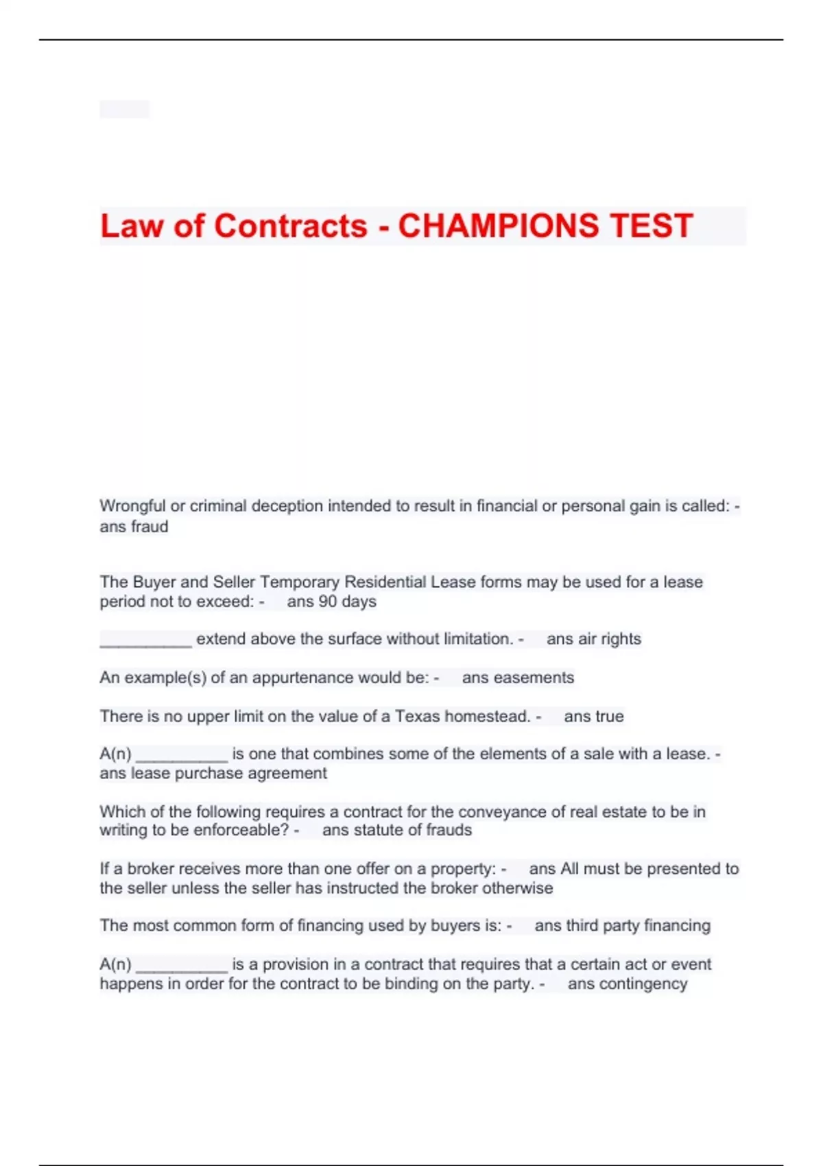 Wrongful or criminal deception intended to result in financial or personal gain is called: - ans fraud The Buyer and Seller Temporary Residential Lease forms may be used for a lease period not to exceed: - ans 90 days __________ extend above the surface without limitation. - ans air rights An example(s) of an appurtenance would be: - ans easements There is no upper limit on the value of a Texas homestead. - ans true A(n) __________ is one that combines some of the elements of a sale with a lease. - ans lease purchase agreement Which of the following requires a contract for the conveyance of real estate to be in writing to be enforceable? - ans statute of frauds If a broker receives more than one offer on a property: - ans All must be presented to the seller unless the seller has instructed the broker otherwise The most common form of financing used by buyers is: - ans third party financing A(n) __________ is a provision in a contract that requires that a certain act or event happens in order for the contract to be binding on the party. - ans contingency